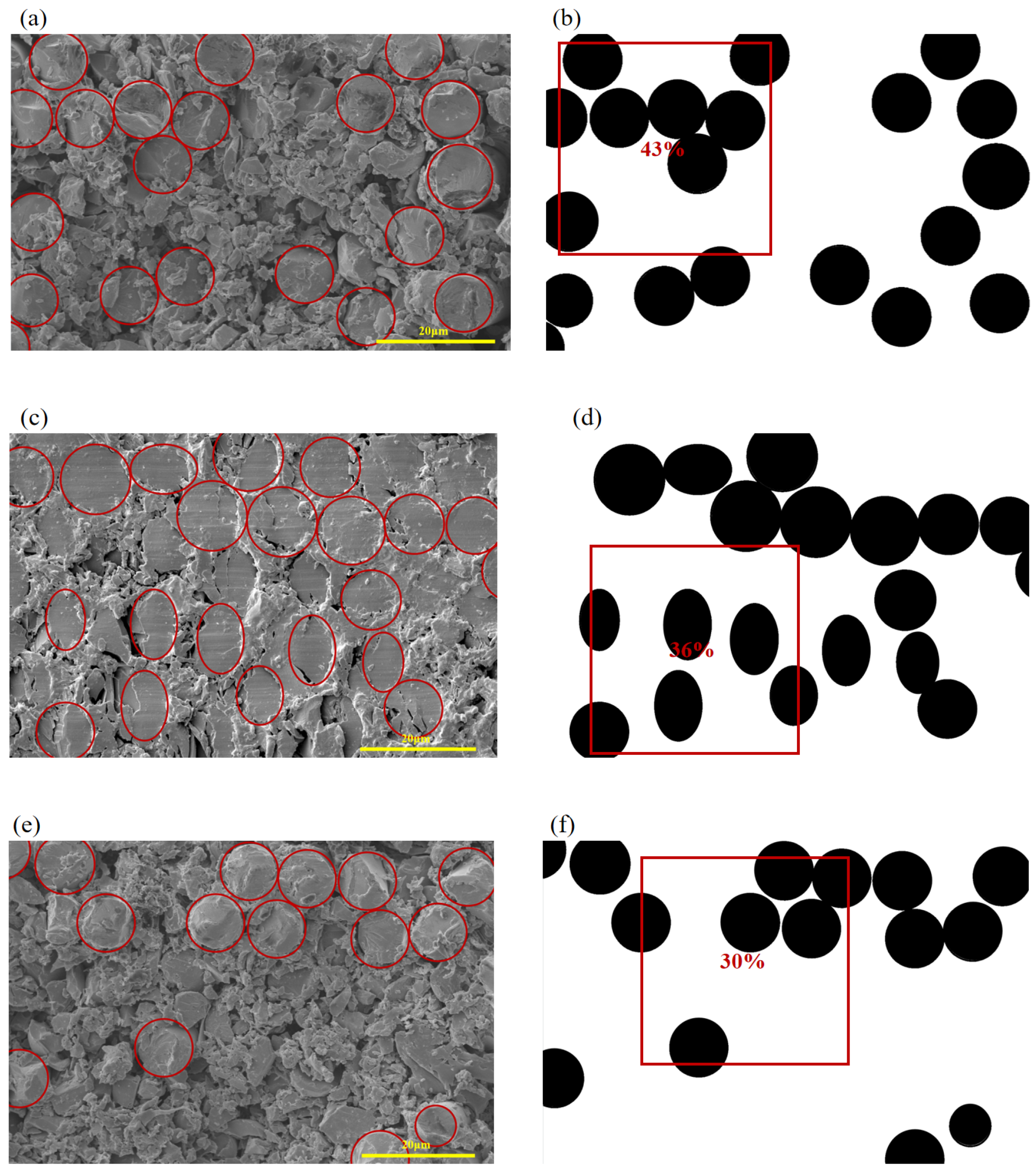 Figure 2. Microstructural features of the material: (a) cross-section of glass-fiber-reinforced composite, (b) equivalent geometric model obtained through image processing, (c) cross-section of glass-fiber-reinforced composite, (d) equivalent geometric model obtained through image processing, (e) cross-section of glass-fiber-reinforced composite, (f) equivalent geometric model obtained through image processing.