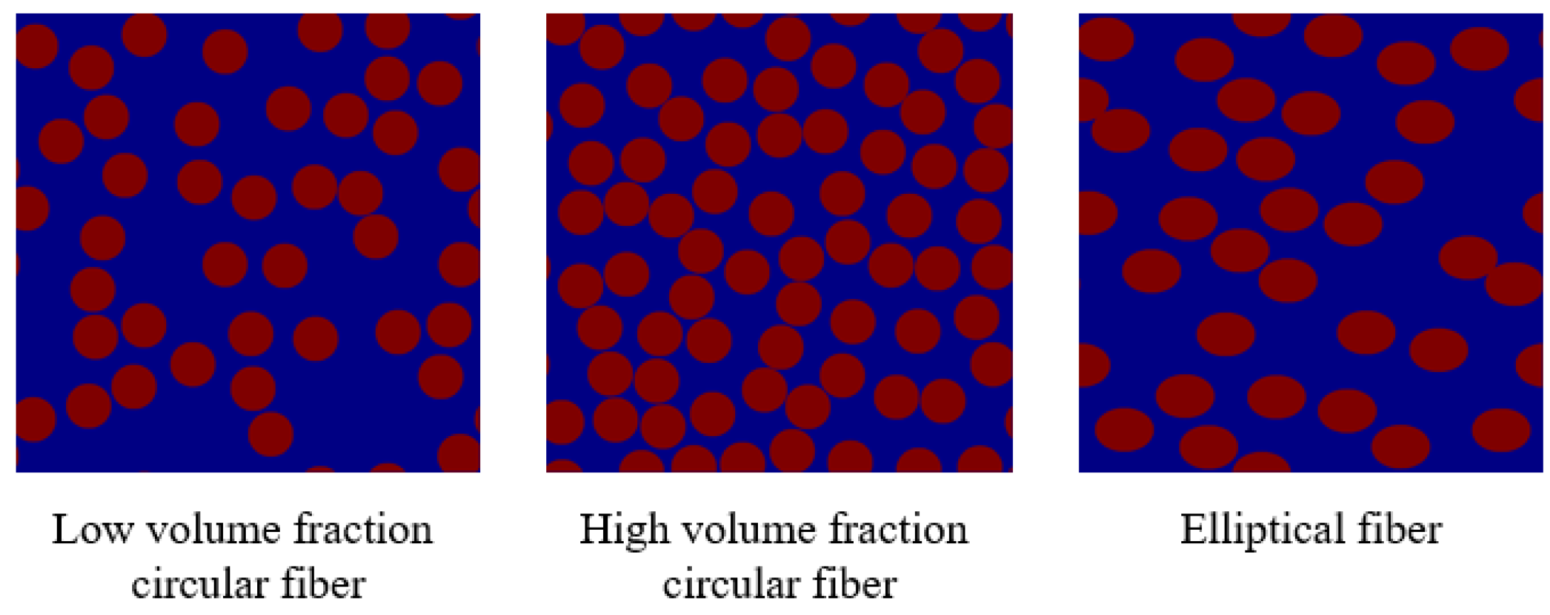 Figure 4. Geometric models of composites with different microstructures(red: fibers; blue: matrix).