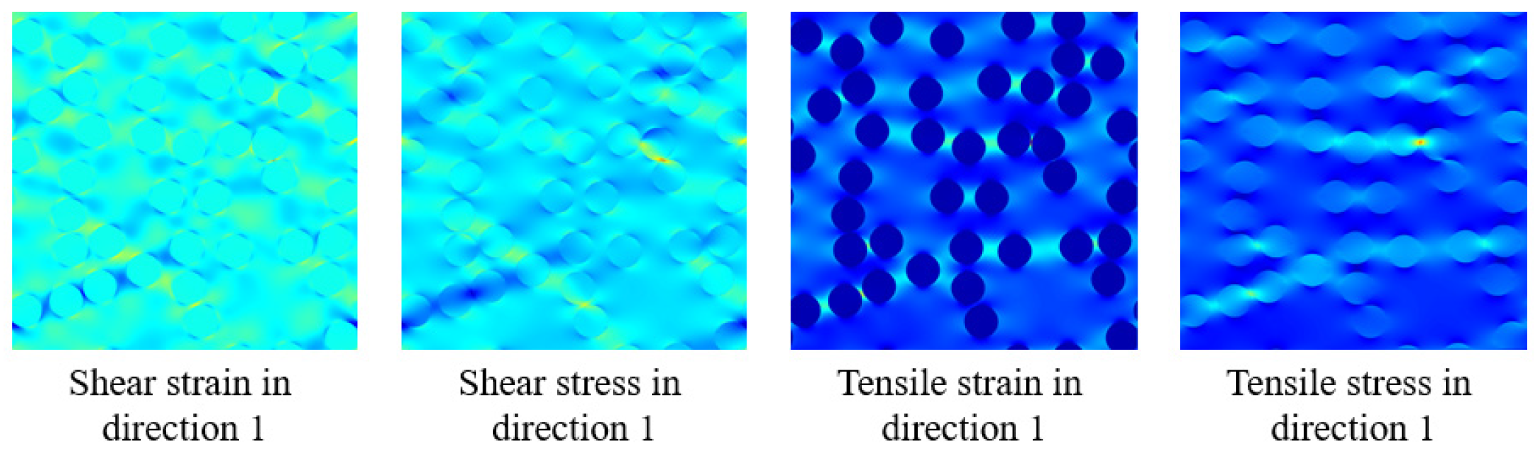 Figure 5 presents representative full-field stress and strain distributions of fiber-reinforced composites under loading in direction 1. The first two subfigures show the shear strain and shear stress distributions in direction 1, while the last two correspond to the tensile strain and tensile stress distributions in the same direction.
