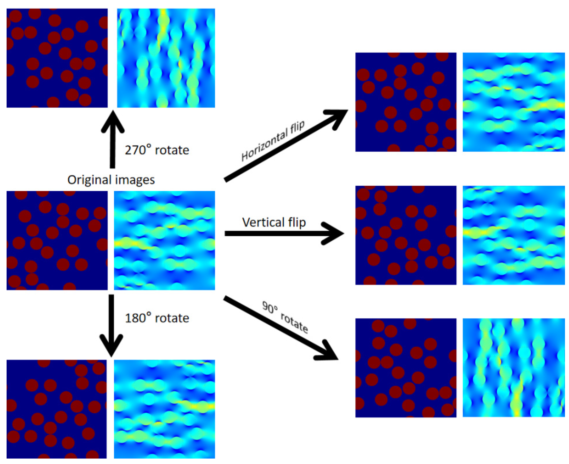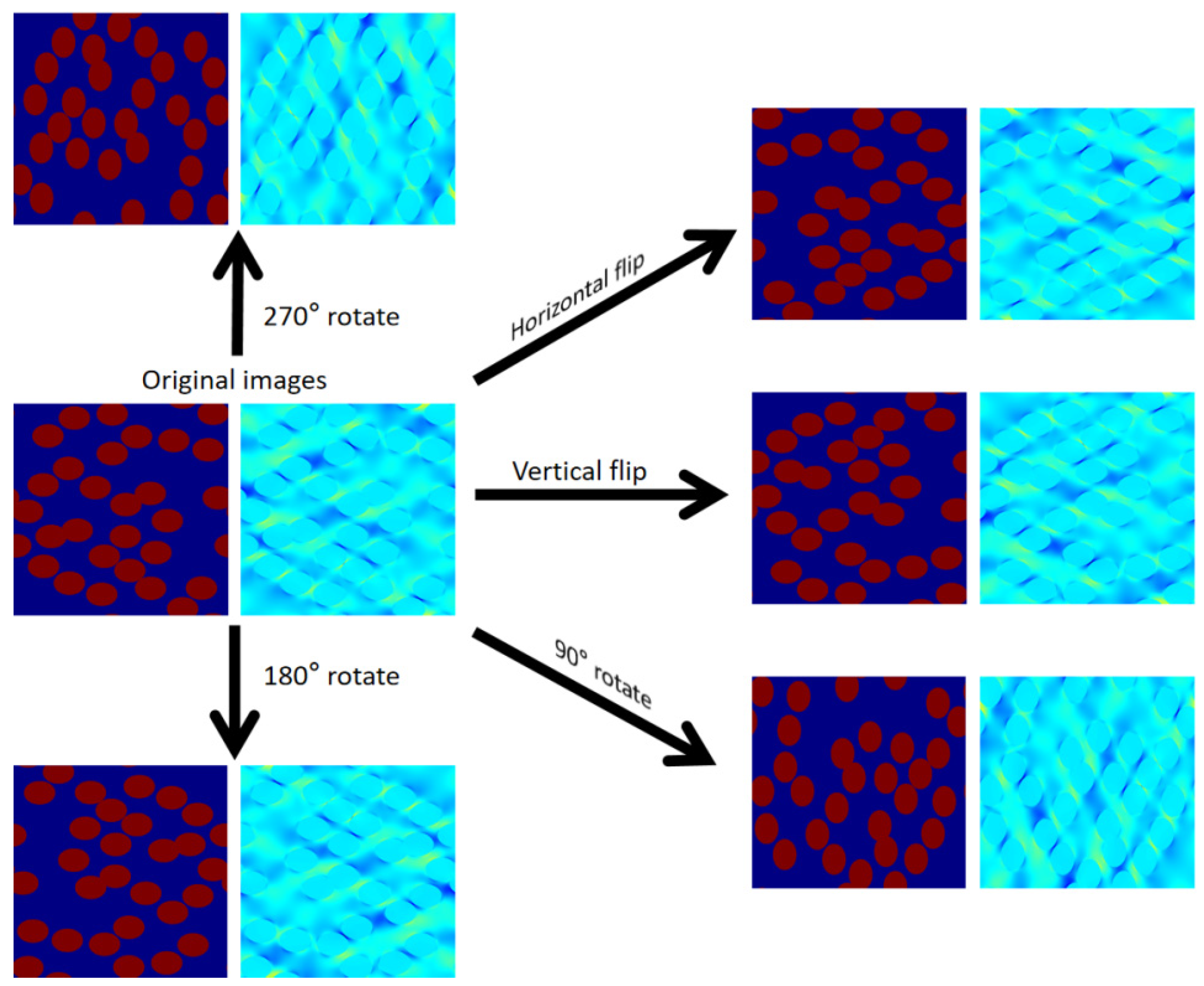 Figure 6, Figure 7, Figure 8 and Figure 9 illustrate the data augmentation process applied to the four target fields of the FiberGAN dataset, including tensile stress, tensile strain, shear stress, and shear strain. For each microstructure–response pair, the original image and its corresponding mechanical field were simultaneously transformed through a series of geometric operations such as rotations of 90°, 180°, and 270°, as well as horizontal and vertical flips, to expand the diversity of training samples. This paired augmentation strategy ensures that the spatial correspondence between the microstructural geometry and the target mechanical field is strictly preserved during all transformations. As shown in the figures, the augmented samples maintain consistent fiber orientations, spatial periodicity, and field distribution patterns, which effectively enhance the FiberGAN’s robustness and generalization when predicting unseen microstructures with varying orientations.