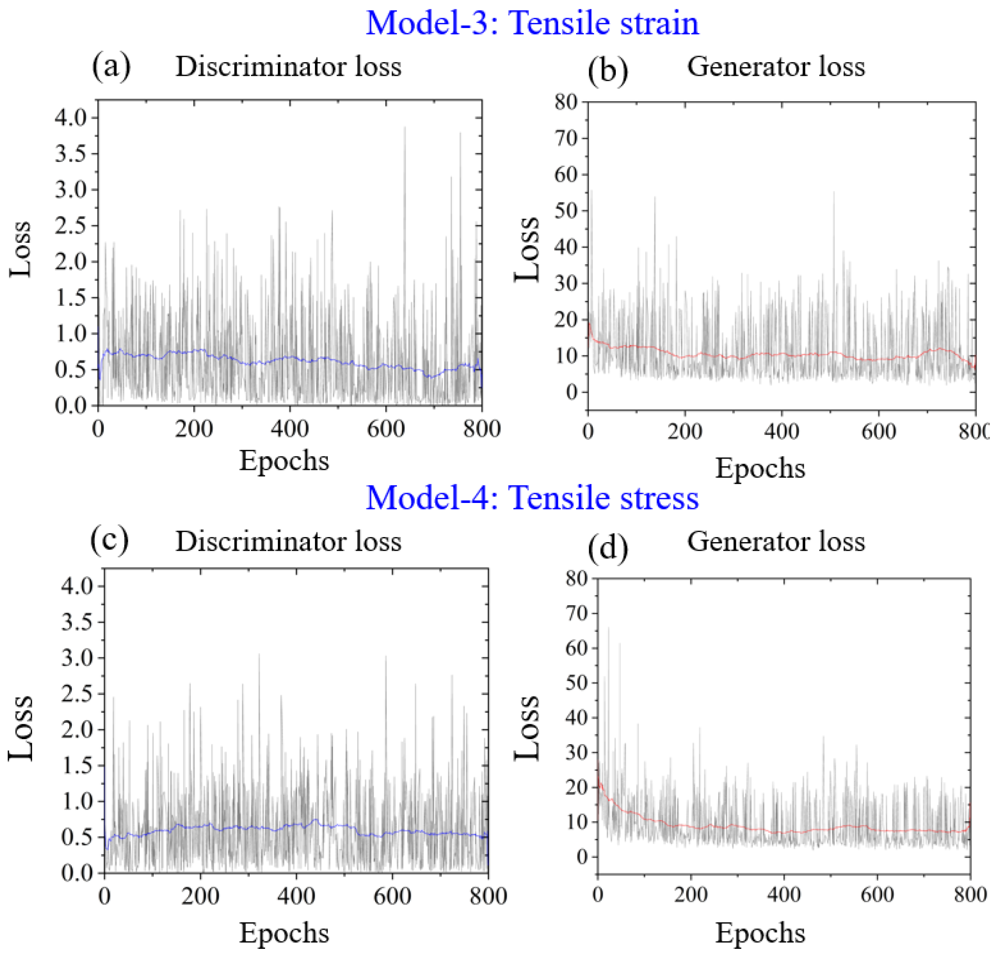 Figure 11. Training loss curves of the FiberGAN models under tensile loading. (a) Discriminator loss and (b) generator loss for Model-3 (tensile strain prediction); (c) discriminator loss and (d) generator loss for Model-4 (tensile stress prediction).