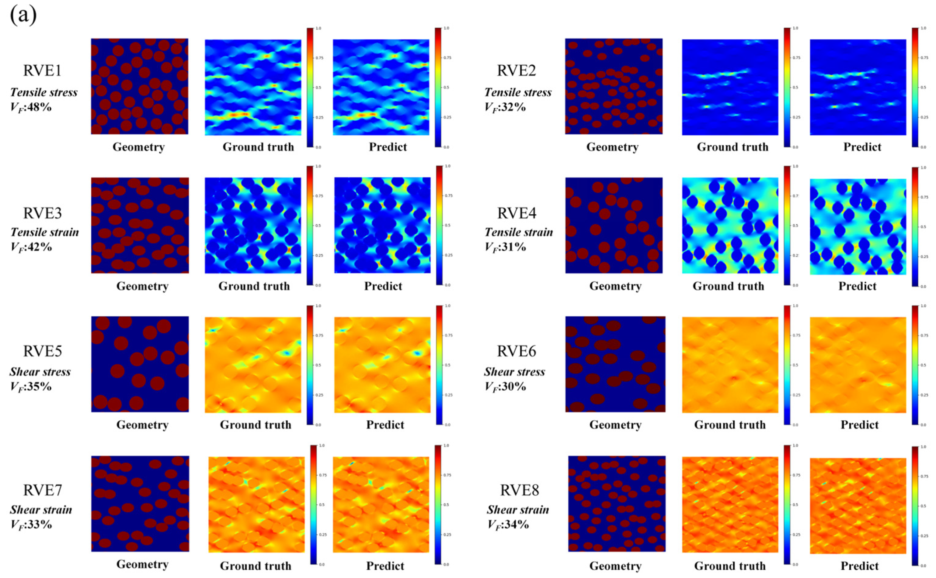 Figure 12a–c show the prediction performance of the proposed FiberGAN model across eight RVE configurations under various loading conditions and fiber volume fractions (Vf). In Figure 12a, each row displays the microstructural geometry, FE-computed ground truth, and the corresponding predicted field for four representative cases: tensile stress (Vf = 48%, 32%), tensile strain (Vf = 42%, 31%), shear stress (Vf = 35%, 30%), and shear strain (Vf = 33%, 34%). The predicted results show excellent agreement with the finite element results, successfully reproducing both global field distributions and localized high-gradient regions. Figure 12b presents the R2 values ranging from 0.96 to 0.98, confirming the model’s strong quantitative accuracy and ability to capture linear correlations between predictions and reference fields. Furthermore, Figure 12c displays the SSIM values between 0.95 and 0.98, indicating that FiberGAN achieves high-fidelity reconstruction of both intensity and structural features across different loading conditions and fiber volume fractions.