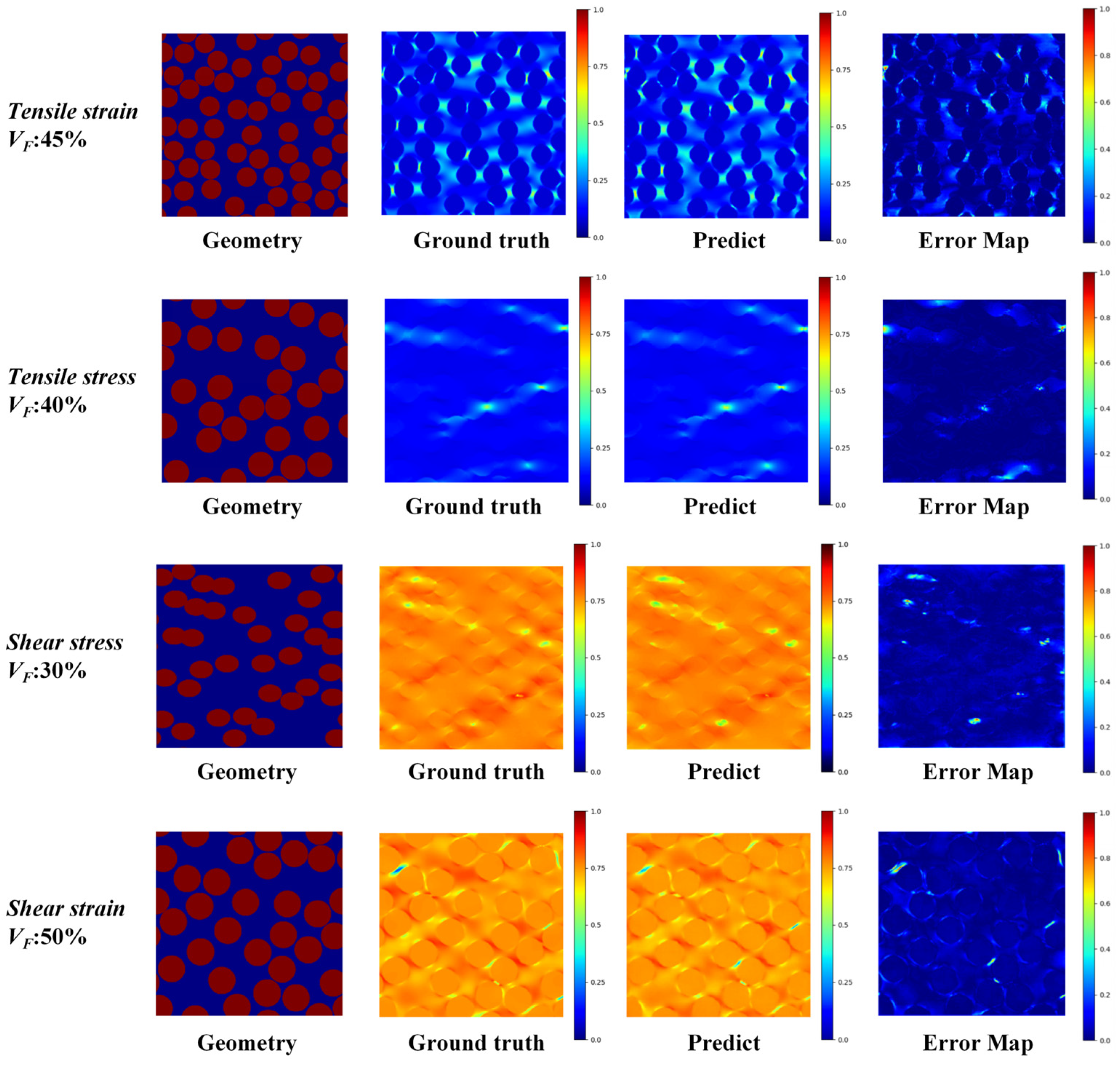 Figure 13. Error maps of prediction results under different fiber volume fractions and mechanical behaviors.