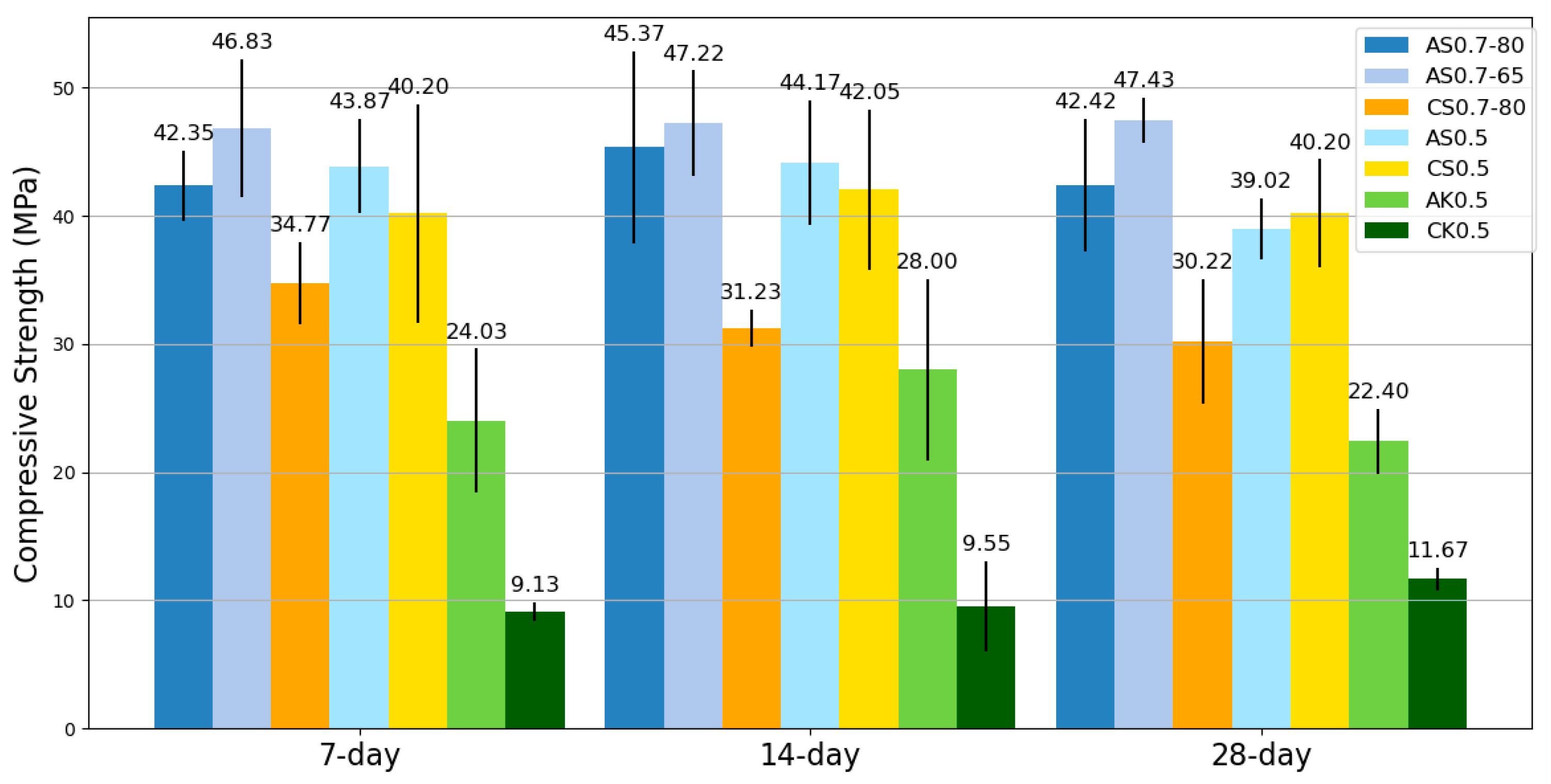 In conclusion, SSA-activated geopolymers present a compelling alternative to traditional SSC-based systems, offering enhanced mechanical properties, improved microstructural integrity, and significant cost benefits. While the environmental impact reduction is modest, the overall performance gains position SSA as a viable and sustainable solution for next-generation geopolymer technology. The results of this study underscore the potential of SSA in advancing geopolymer applications, providing a practical pathway toward more sustainable and durable construction materials.