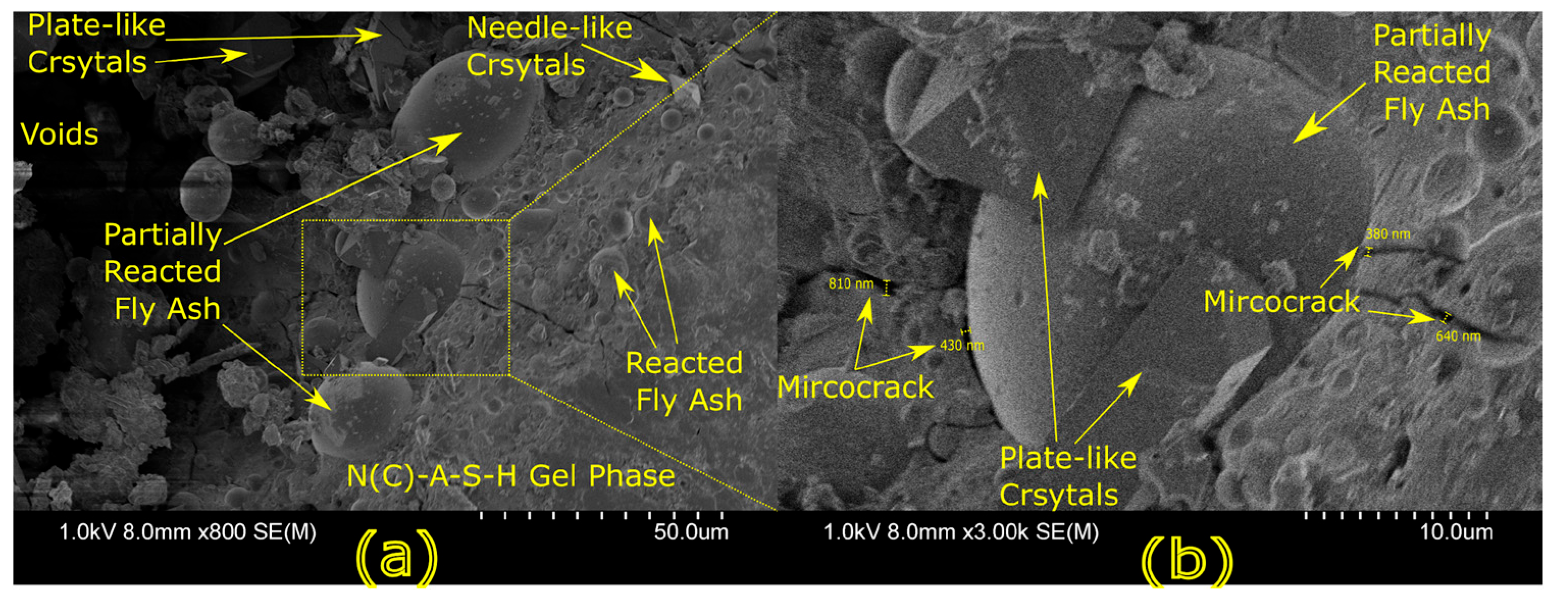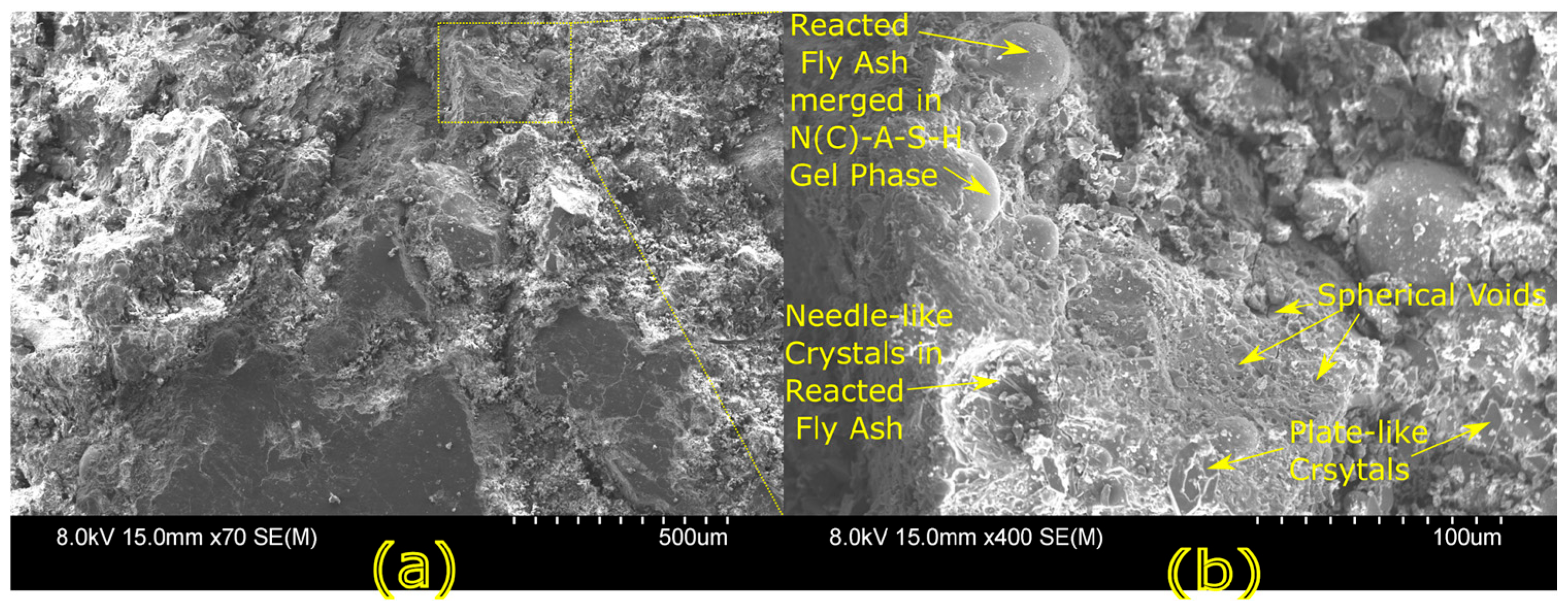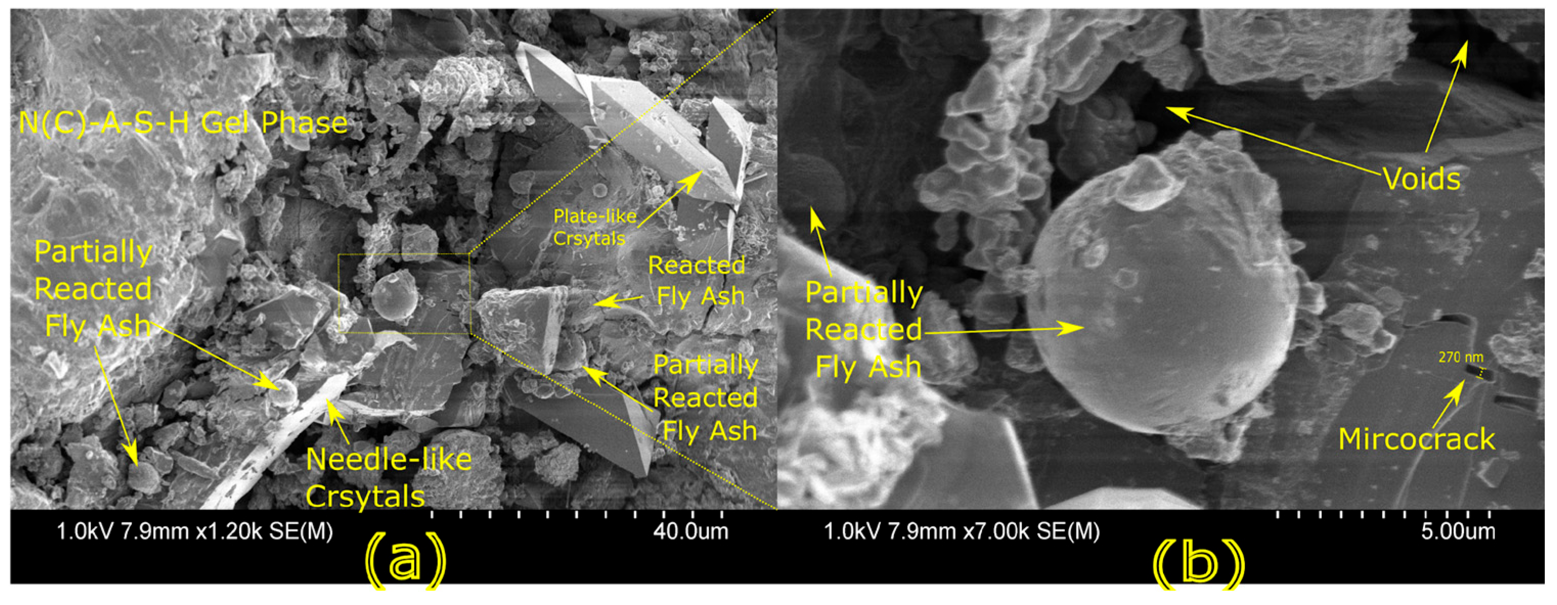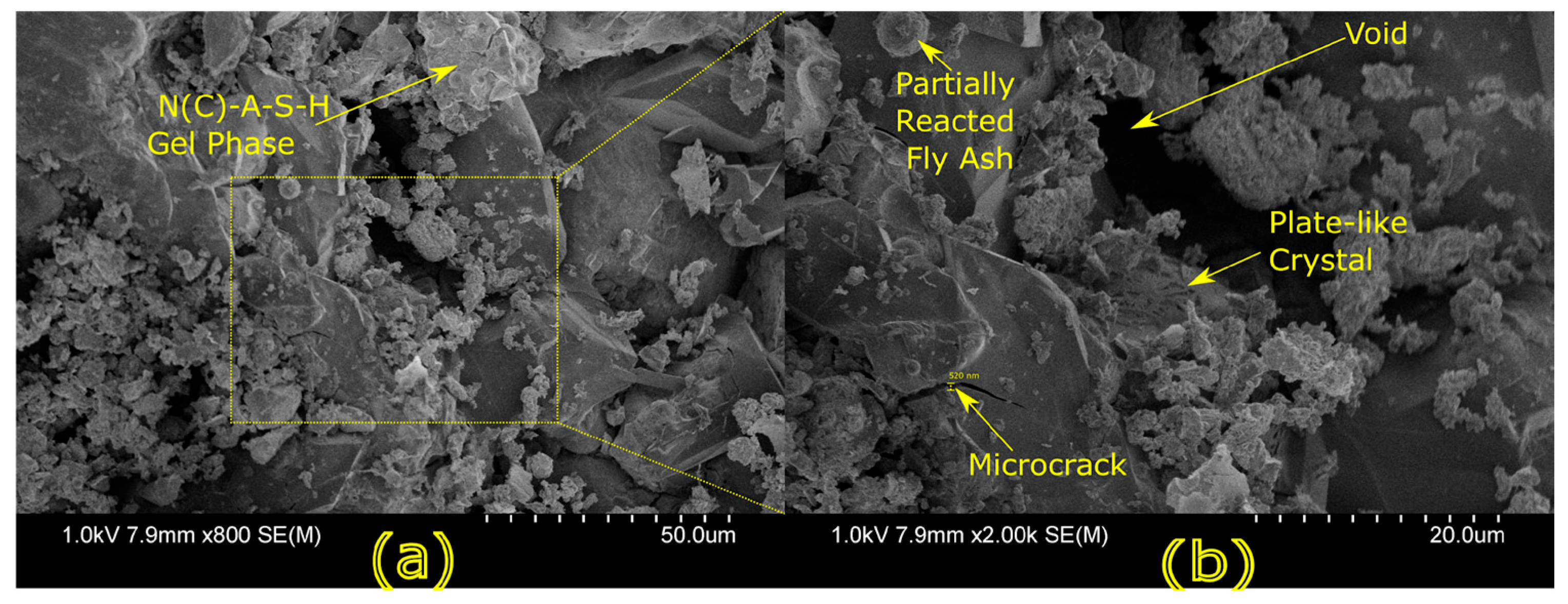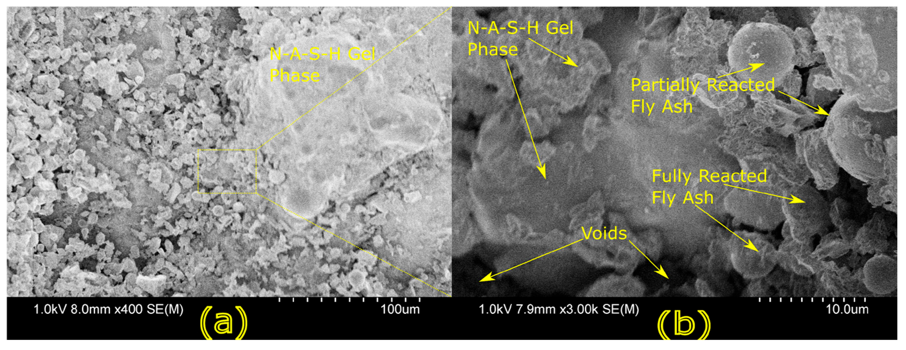 23]. Studies have shown that dense matrices with sodium aluminosilicate hydrate (N-A-S-H) and calcium aluminosilicate hydrate (C-A-S-H) gels correlate with enhanced strength and reduced permeability [