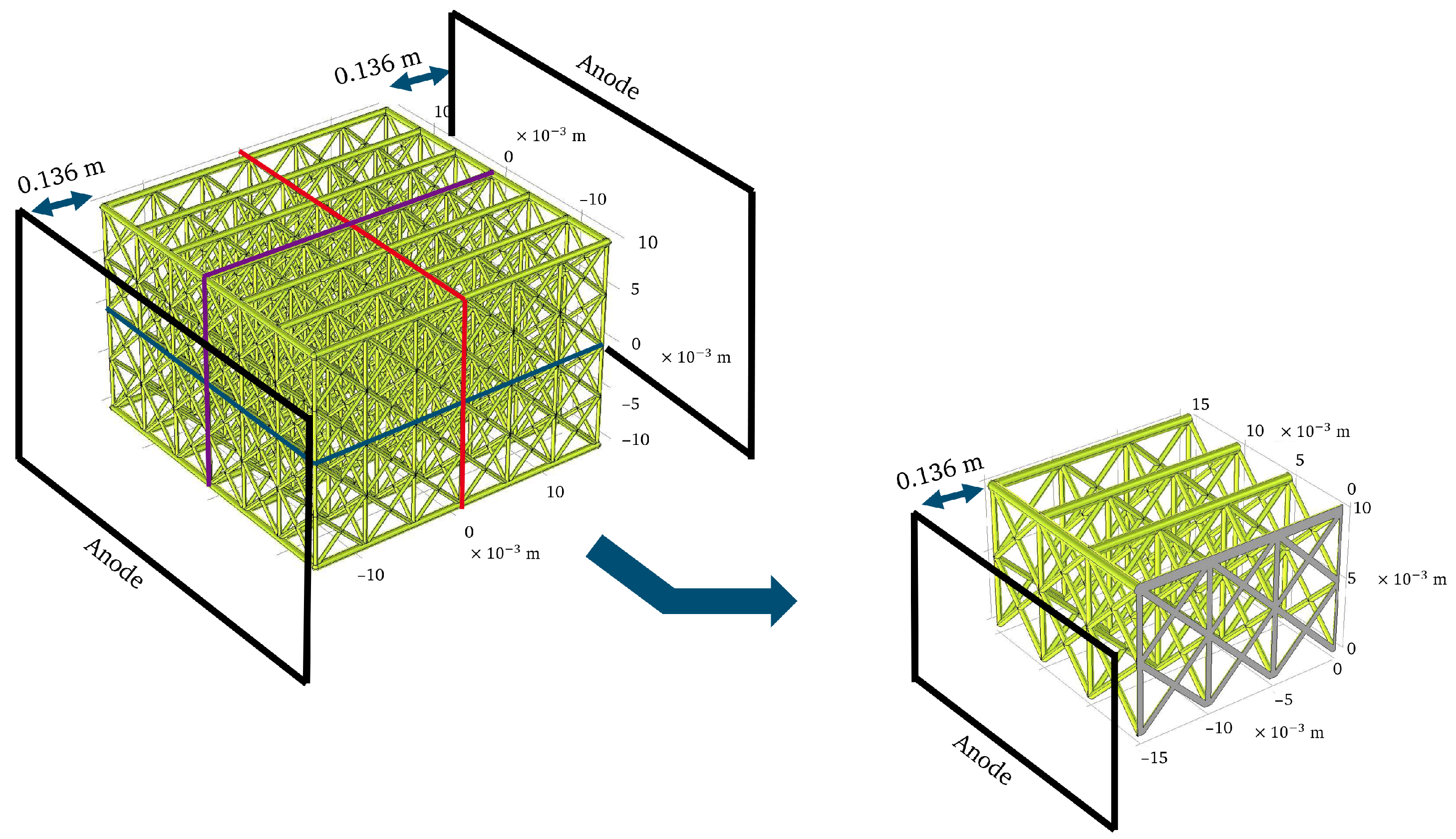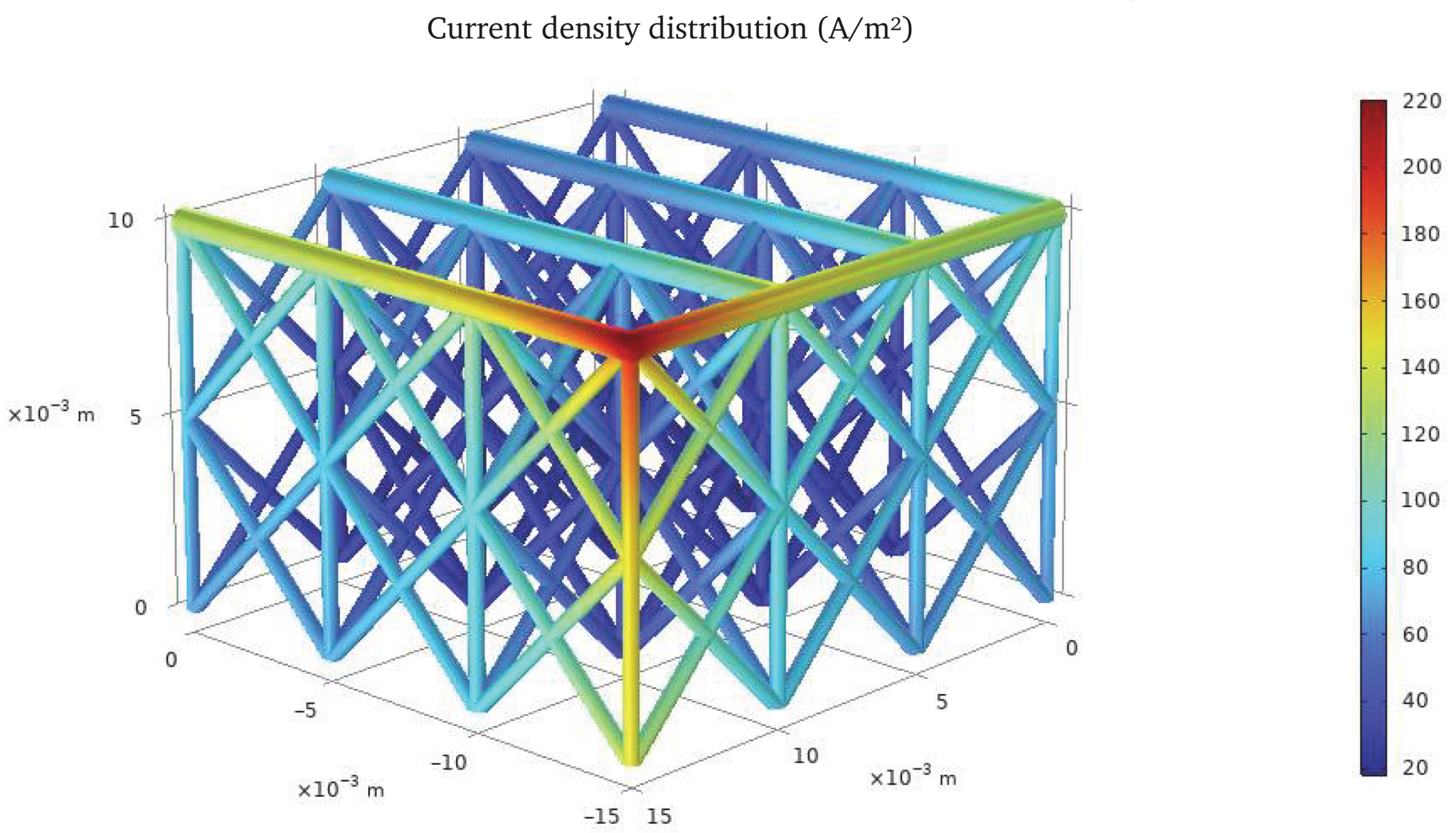 Figure 4) successfully captured the experimentally observed coating distribution patterns. The inclusion of electrode reaction kinetics through exchange current density and limiting current density parameters enabled realistic prediction of coating gradients across the complex lattice geometry. The model’s ability to account for activation and concentration overpotentials proved essential for accurate simulation of the electrodeposition process.