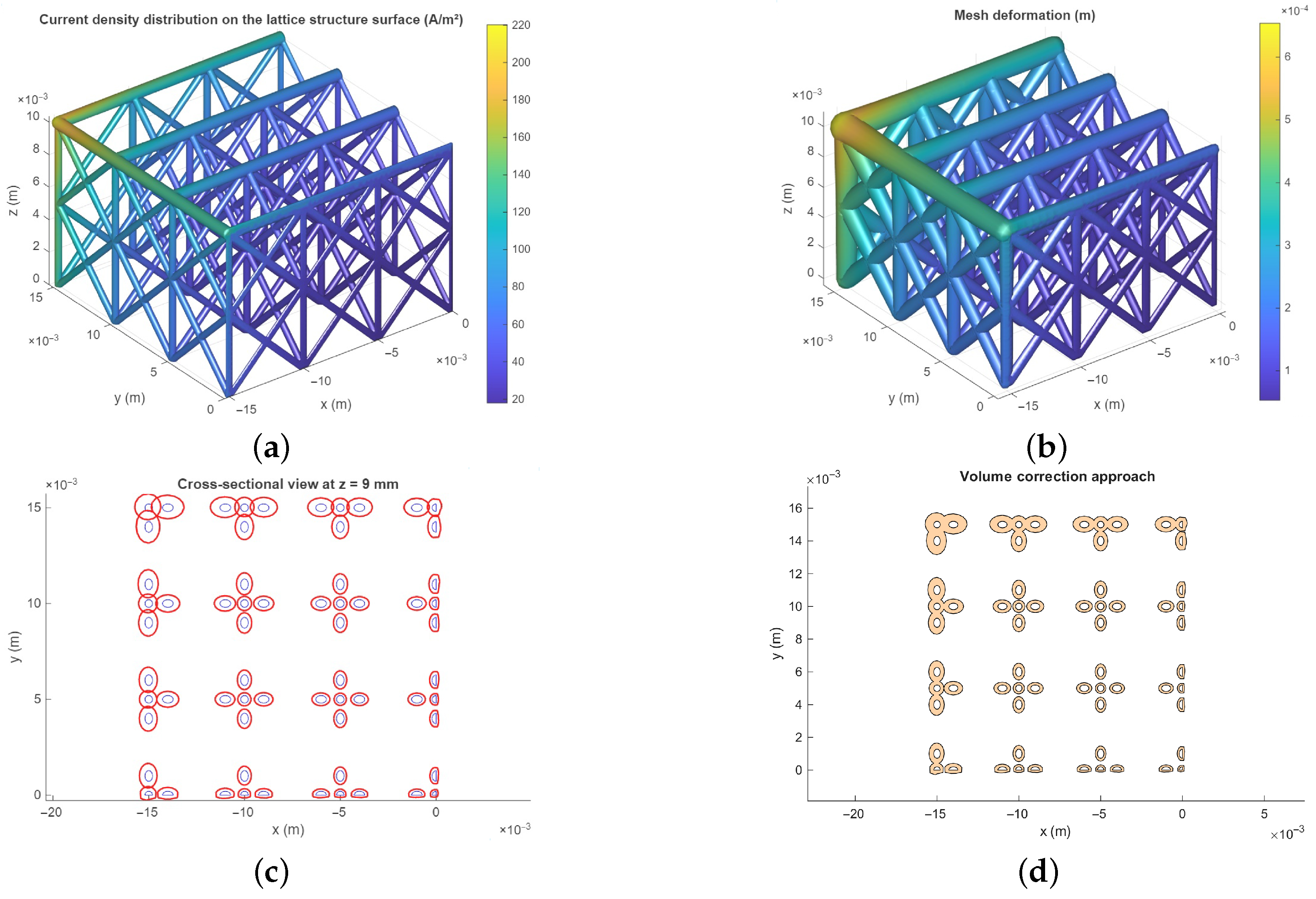 The complex three-dimensional geometry of lattice structures poses significant challenges for electrochemical modeling. Current density distribution is governed by the component geometry, electrolyte conductivity, and electrode kinetics, resulting in nonuniform coating deposition. The electrochemical process is fundamentally described by the Butler–Volmer equation, which relates current density to overpotential through electrode kinetics parameters. For complex geometries, accurate prediction requires finite element simulation that captures the electrochemical field distribution within the intricate lattice geometry, typically employing Laplace’s equation for potential distribution in the electrolyte. Recent investigations have demonstrated that geometric modifications, such as sheet covers, can significantly influence filling behavior and current distribution during electrochemical joining of additively manufactured components [
