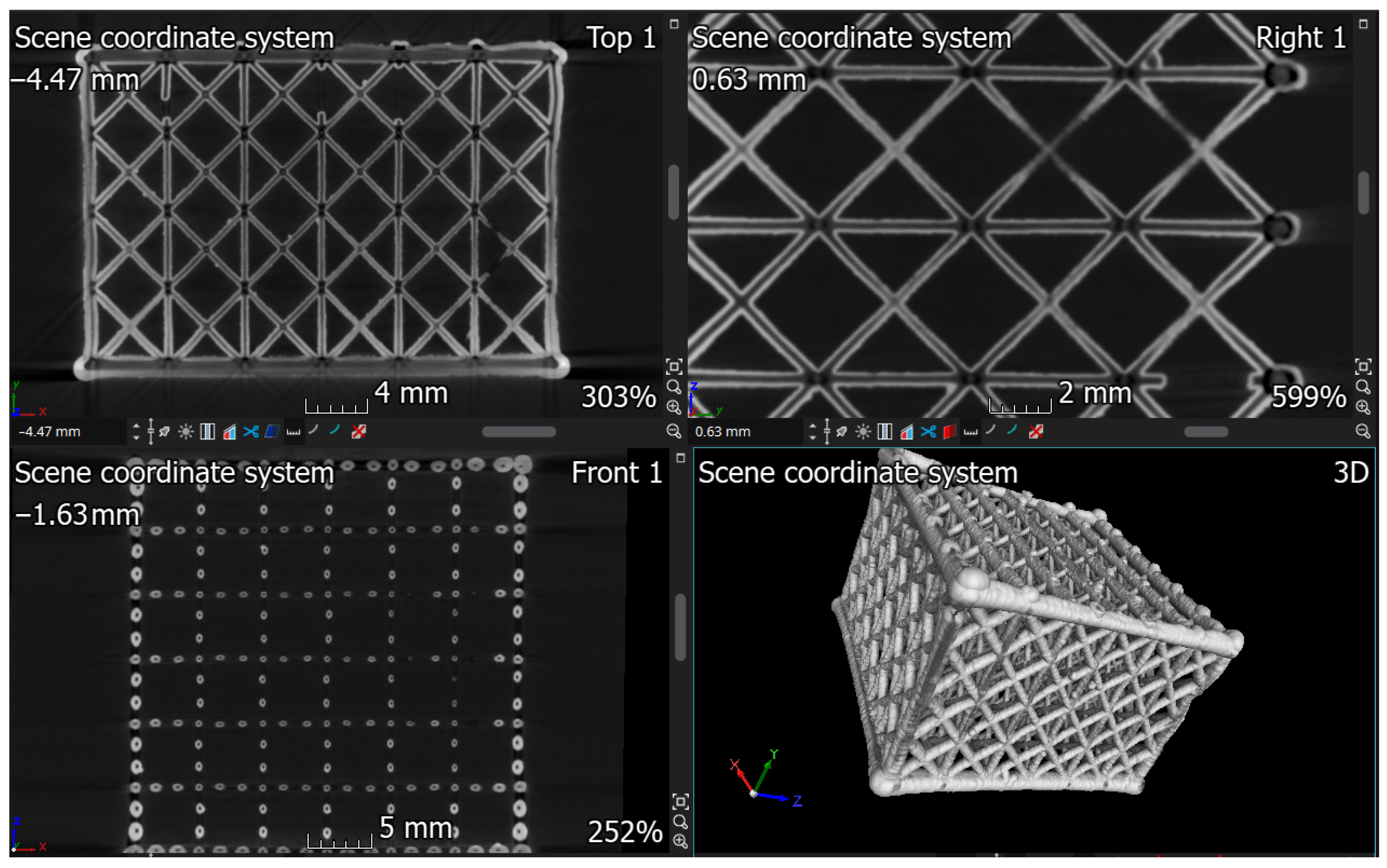 Cross-sectional microscopy confirmed the CT findings but was limited to 2D analysis. The automated image analysis successfully identified coating boundaries but struggled with merged coatings where adjacent struts grew together, a phenomenon correctly predicted by the simulation.