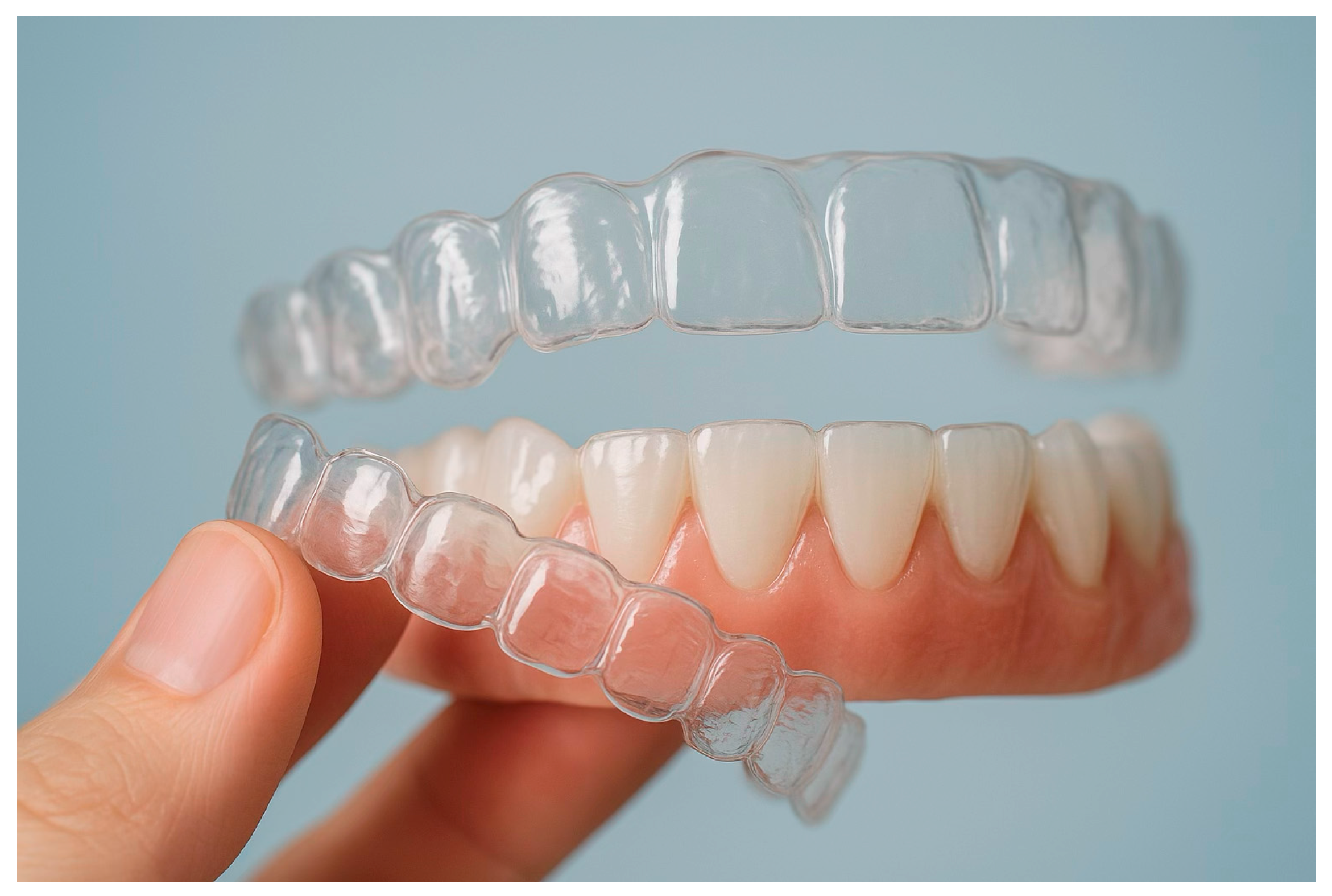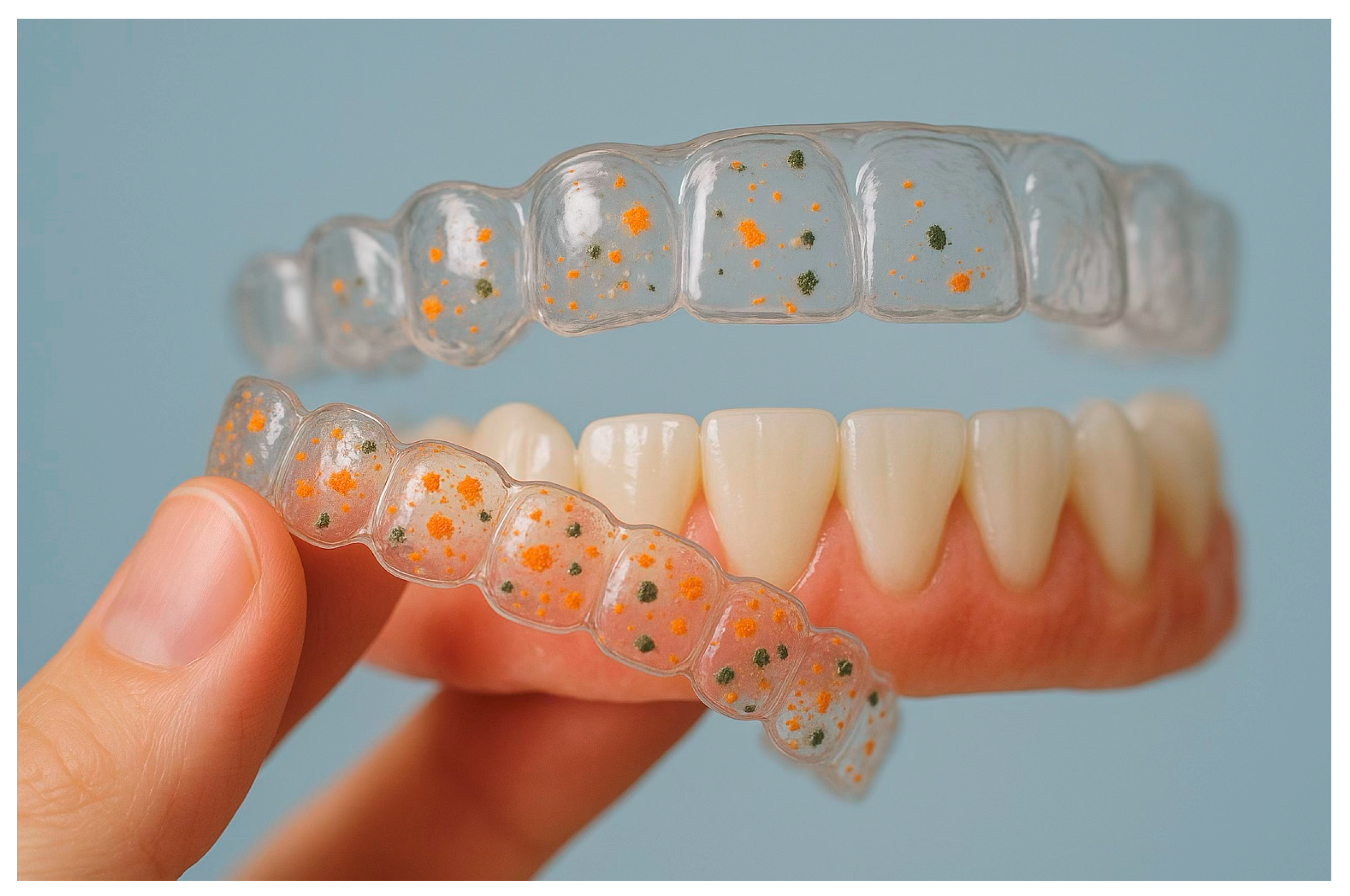 Figure 4. Clinical illustration showing clear orthodontic aligners with visible accumulation of microorganisms on the surface.