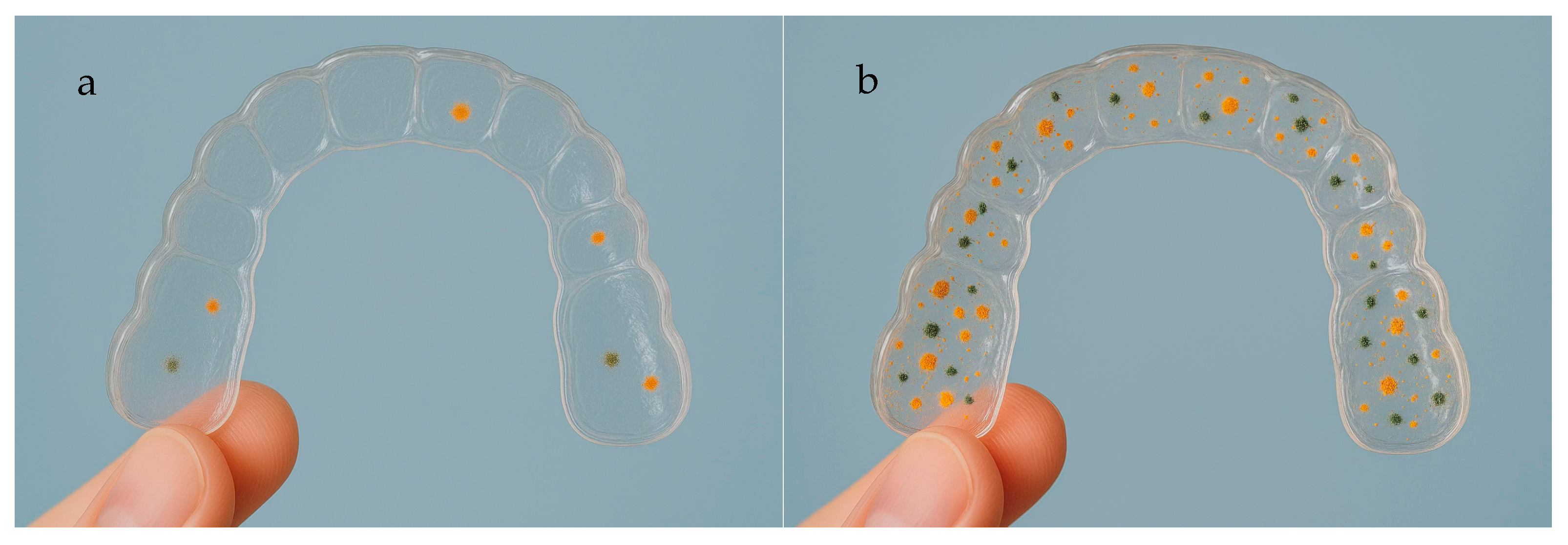 Figure 3, Figure 4 and Figure 5 illustrate clinical differences in microbial accumulation on clear orthodontic aligners and are provided as illustrative examples, not as data derived from the included studies. Figure 3 presents a clinical image of a clear aligner exhibiting a clean and transparent surface, with no visible accumulation of microorganisms, reflecting optimal oral hygiene and effective maintenance. In contrast, Figure 4 shows a clear aligner with evident microbial deposits and surface cloudiness, indicating biofilm accumulation due to inadequate cleaning or prolonged wear. Figure 5 provides a detailed view of the inner surface of clear aligners, highlighting variations in microbial adherence and biofilm development. In Figure 5a, a lower level of bacterial adhesion is observed, while Figure 5b demonstrates a denser microbial layer and more extensive biofilm formation. These images collectively emphasize the importance of proper 3D-printed aligner hygiene to prevent bacterial colonization and maintain oral health during orthodontic treatment.