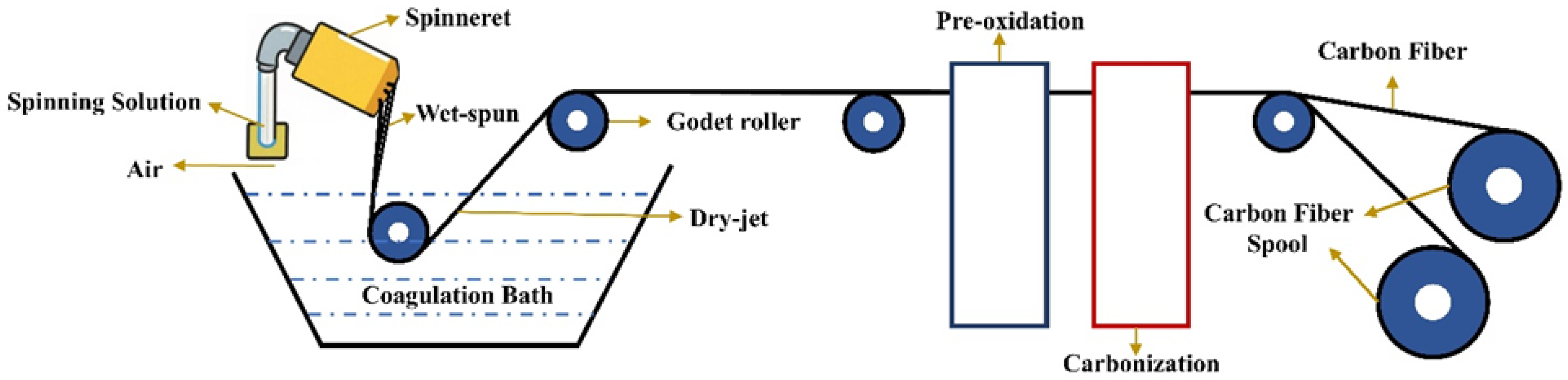 - Choi, J.; Jeon, C.; Lee, J.-E.; Lee, G.-H.; Hwang, S.; Han, M.; Lee, S.; Gwak, H.J.; Lee, E.; Won, J.S.; et al. Optimization of the carbonization process based on the evolution of microstructural components of polyacrylonitrile (PAN)-based fibers. Carbon 2025, 235, 120058. [Google Scholar] [CrossRef]