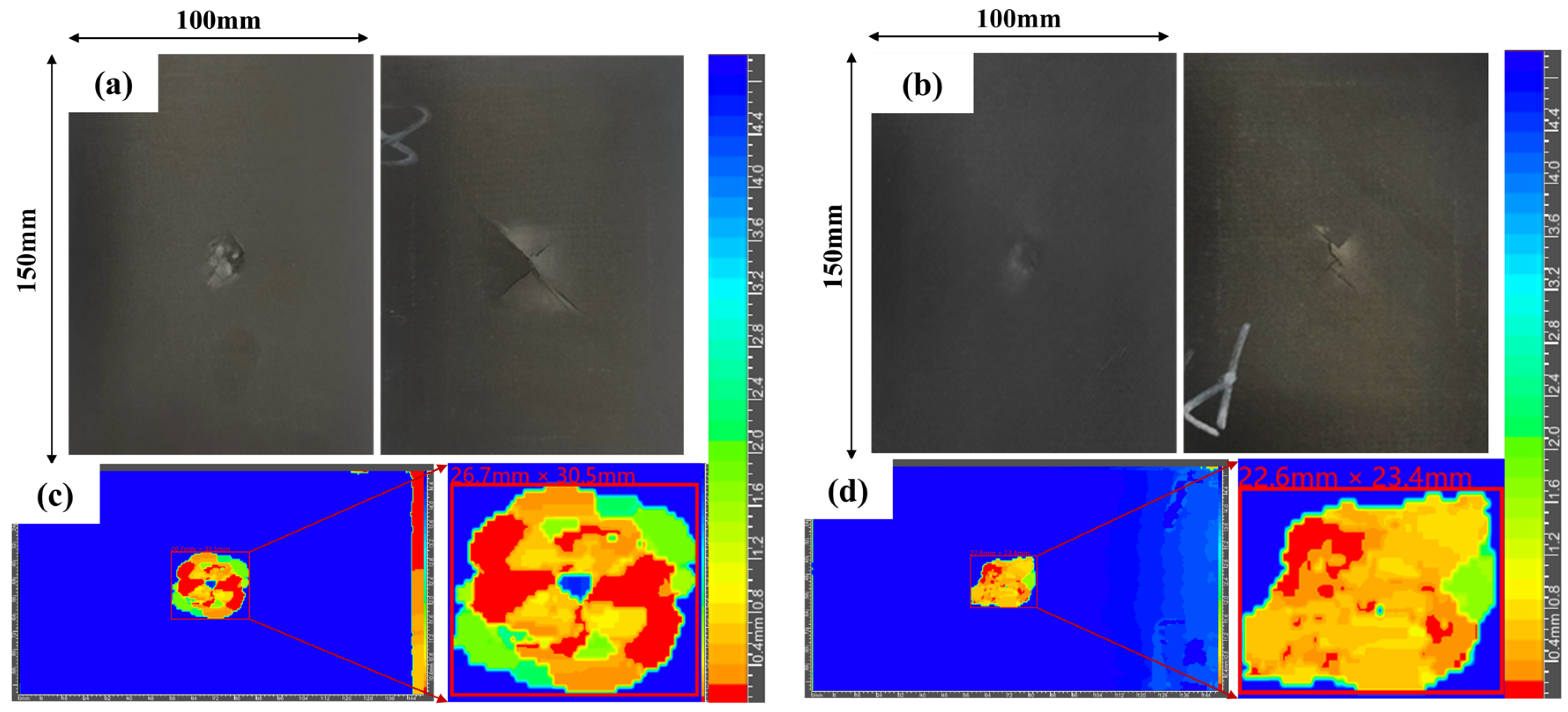 - Brooks, R.A.; Liu, J.; Hall, Z.E.C.; Joesbury, A.M.; Harper, L.T.; Liu, H.; Kinloch, A.J.; Dear, J.P. The Relationship Between the Extent of Indentation and Impact Damage in Carbon-Fibre Reinforced-Plastic Composites after a Low-Velocity Impact. Appl. Compos. Mater. 2024, 31, 1869–1888. [Google Scholar] [CrossRef]