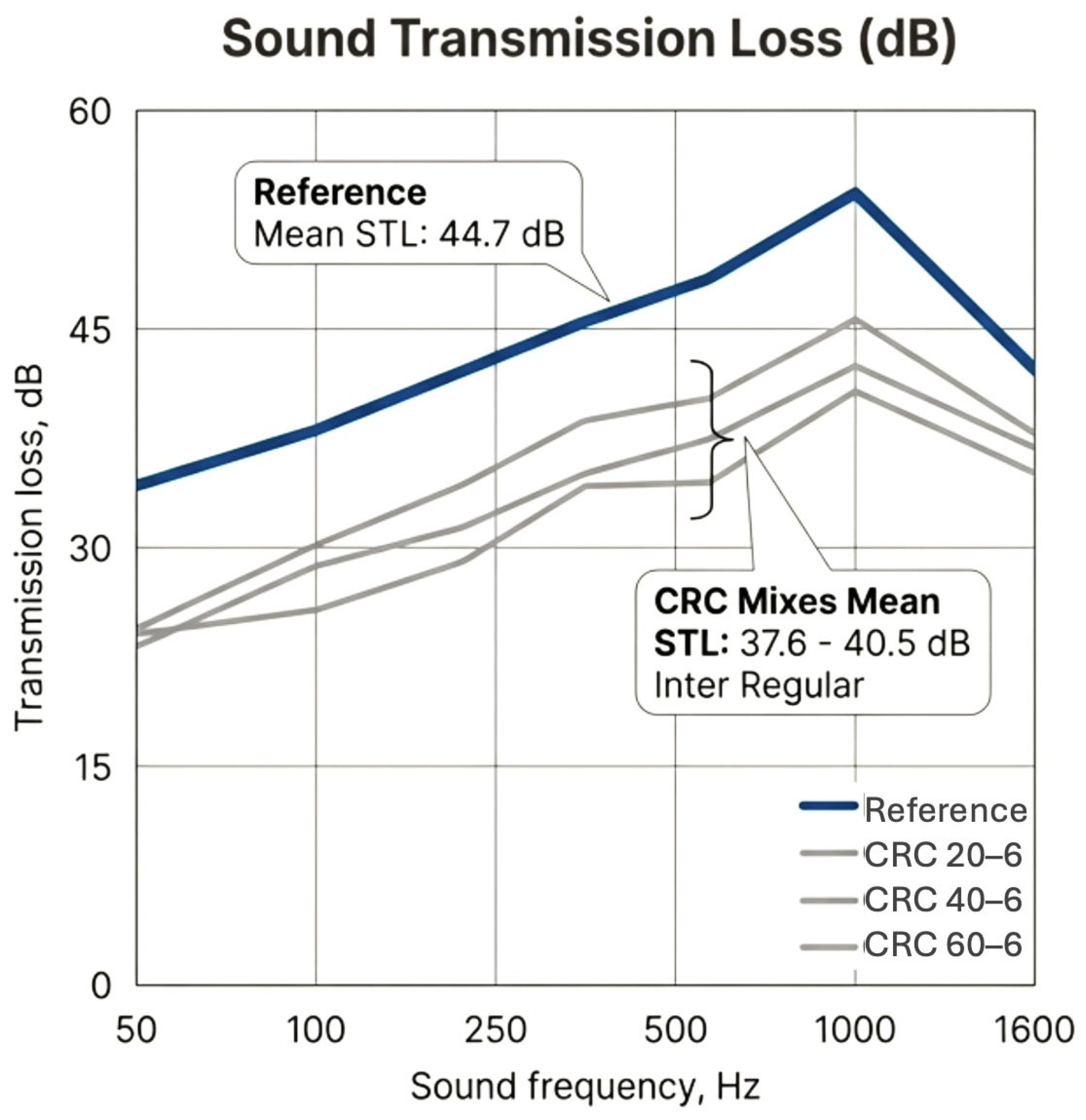 23] found that CRC performance as an insulator was comparable to that of plain concrete, with only marginal differences, performing marginally worse (approximately 5 dB lower) than plain concrete at frequencies between 1000 and 4000 Hz. They concluded that, despite slightly reduced insulation properties, CRC combined with improved absorption could effectively reduce urban noise.