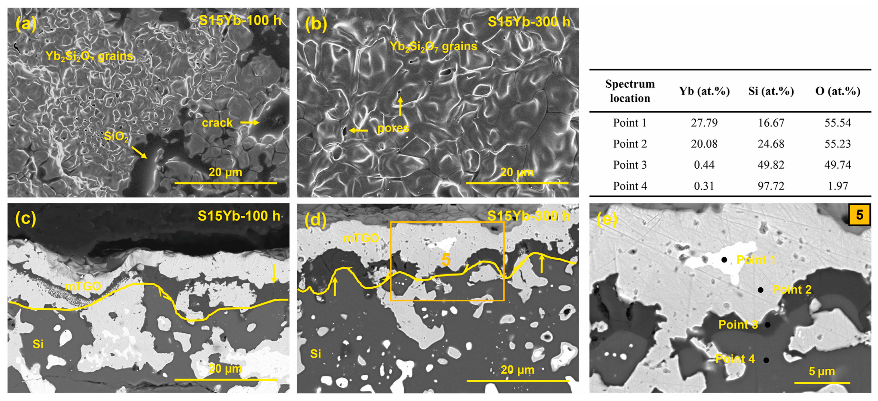 - Yu, S.; Chen, G.; Fu, J.; Wang, S.; Zhao, Q.; Li, Y.; Ren, D.; Zou, Y.; Wang, Y.; Ouyang, J.; et al. Yb2SiO5-Yb2Si2O7 gradient environment barrier coating: Rational design and corrosion behavior in water vapor environment at 1300 °C. J. Eur. Ceram. Soc. 2024, 44, 6097–6112. [Google Scholar] [CrossRef]