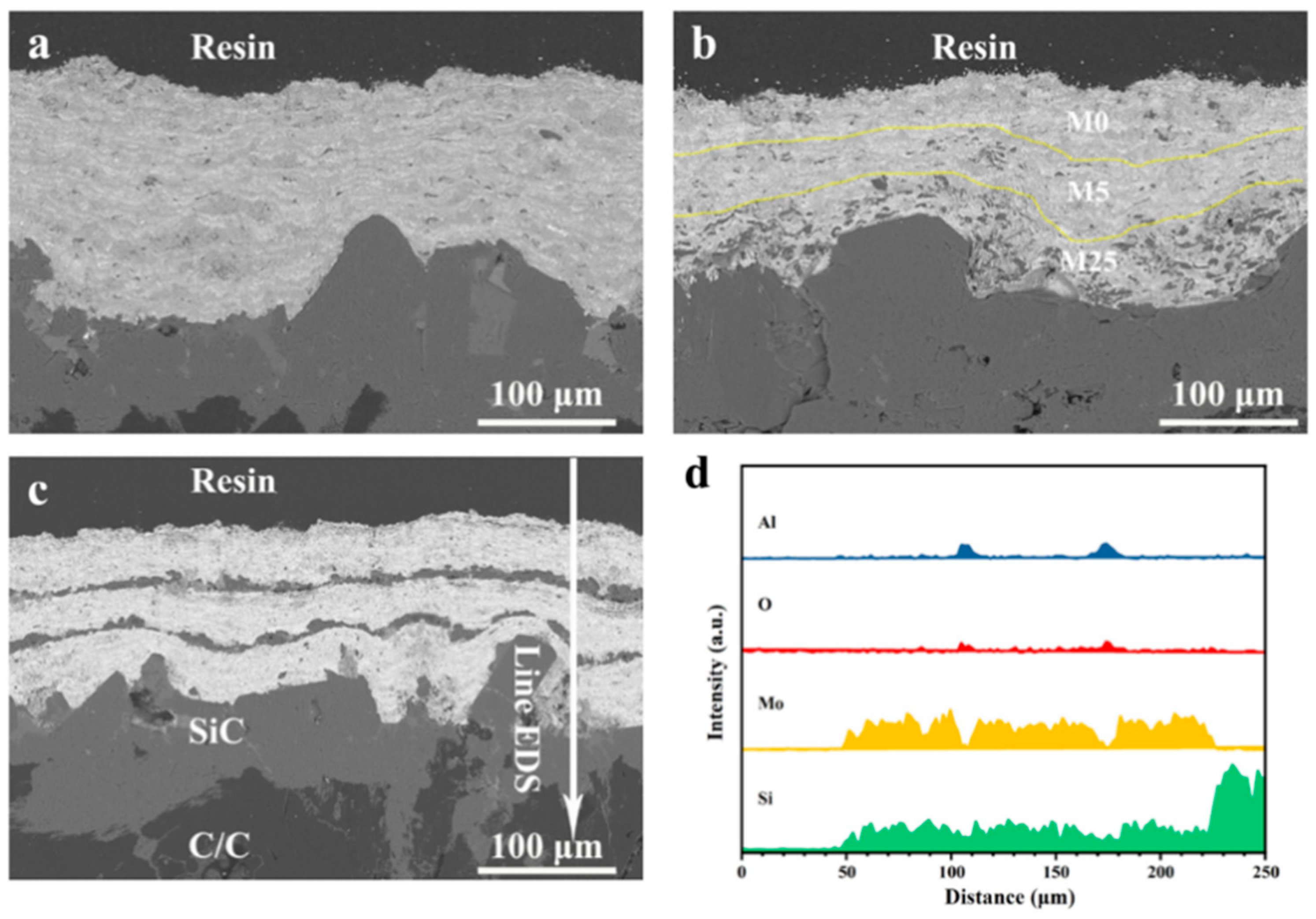 - Xie, C.; Song, S.; He, G.; Mao, Z.; Ma, C.; Zhang, T.; Hu, P.; Zhen, Q. The toughening design of multi-layer antioxidation coating on C/C matrix via SiC-SiCw transition layer grown in-situ. J. Eur. Ceram. Soc. 2022, 42, 43–51. [Google Scholar] [CrossRef]