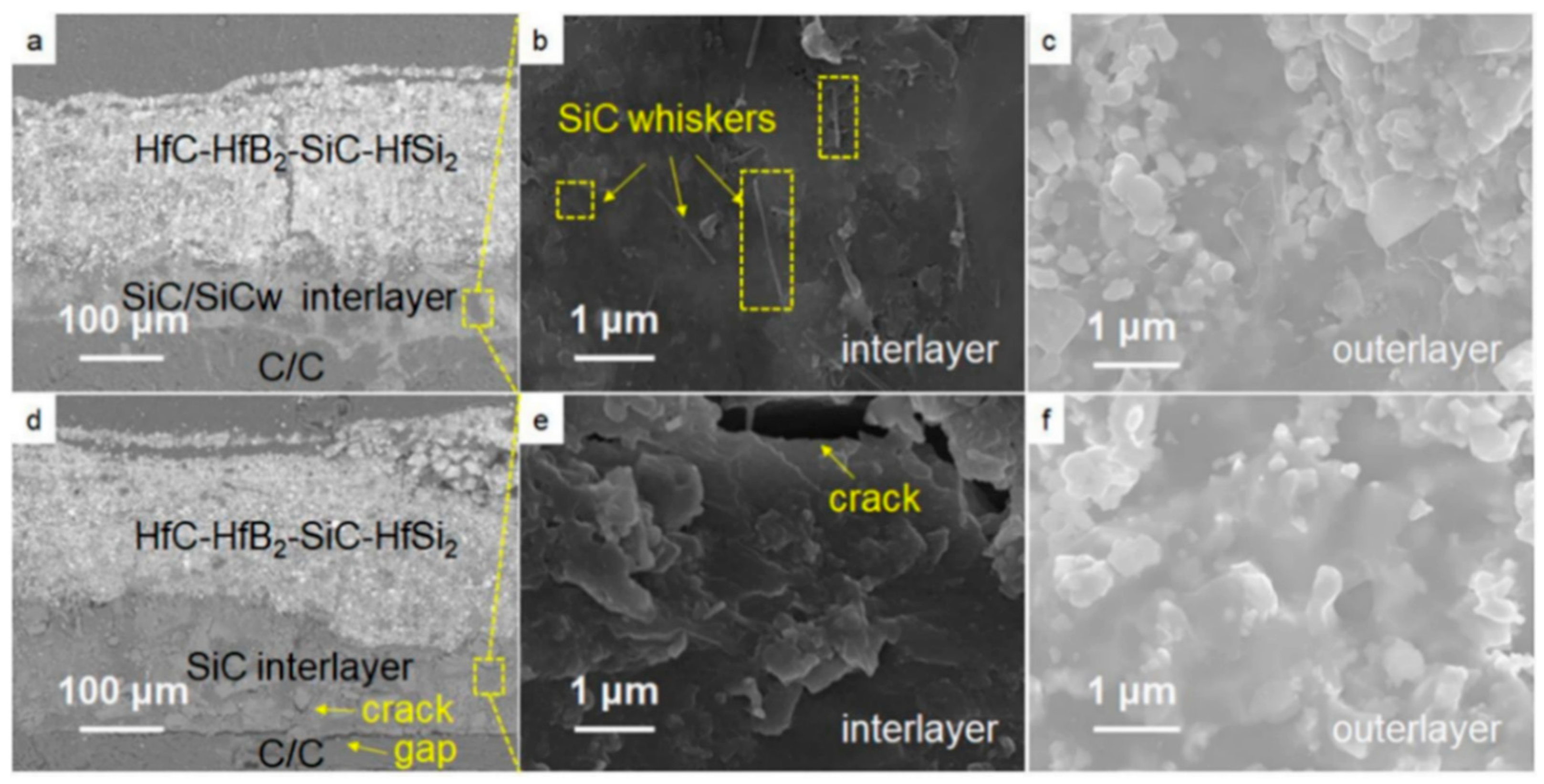 - Chen, C.; Li, W.; Zhen, Q.; Li, R.; Li, X.; Wang, J. In-situ SiC-SiCw layer enhances HfC-HfB2-SiC coatings for 2500 °C ablation. Surf. Coat. Technol. 2025, 509, 132184. [Google Scholar] [CrossRef]