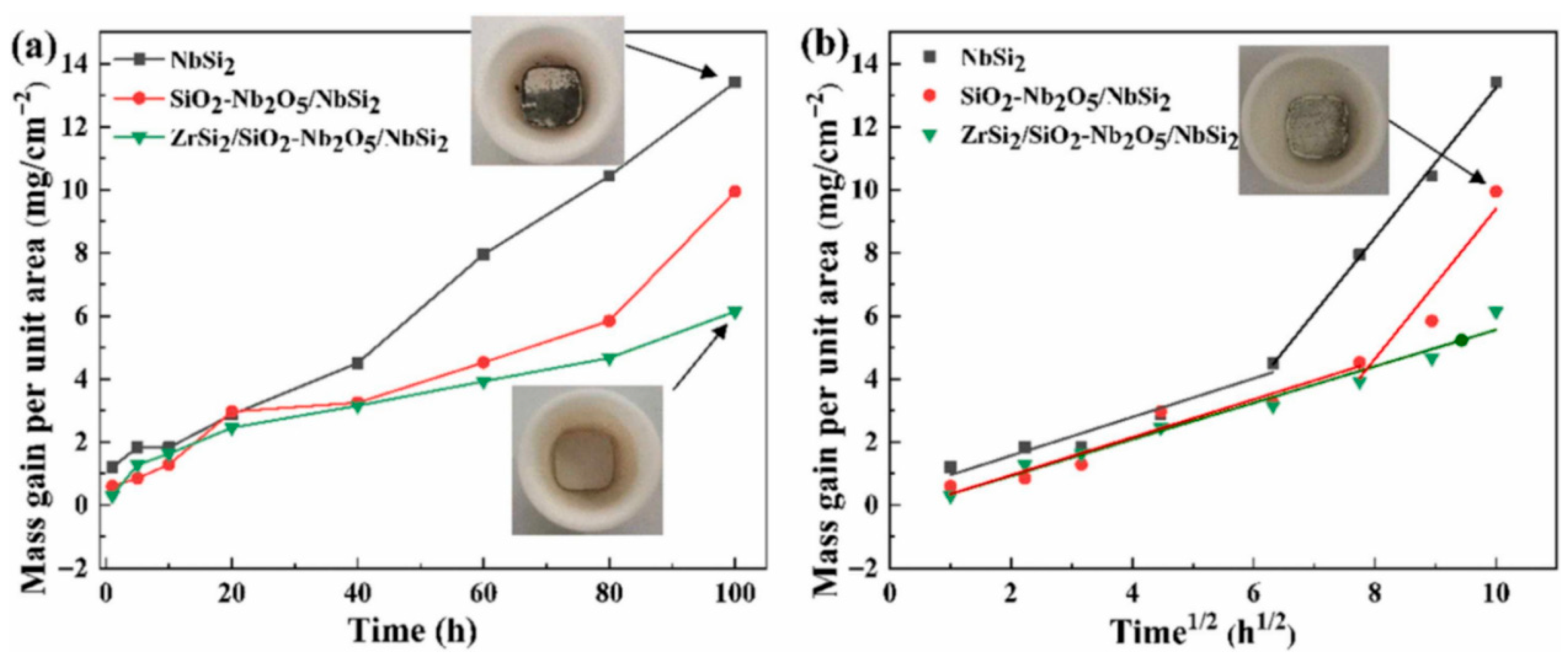 - Fu, T.; Zhan, S.; Zhang, Y.; Shen, F.; Wang, H. Preparation of Si-rich NbSi2 coating on Nb surface by hot dip silicon-plating technology to improve the high-temperature oxidation resistance of pure Nb substrate. Ceram. Int. 2025, 51, 23341–23353. [Google Scholar] [CrossRef]