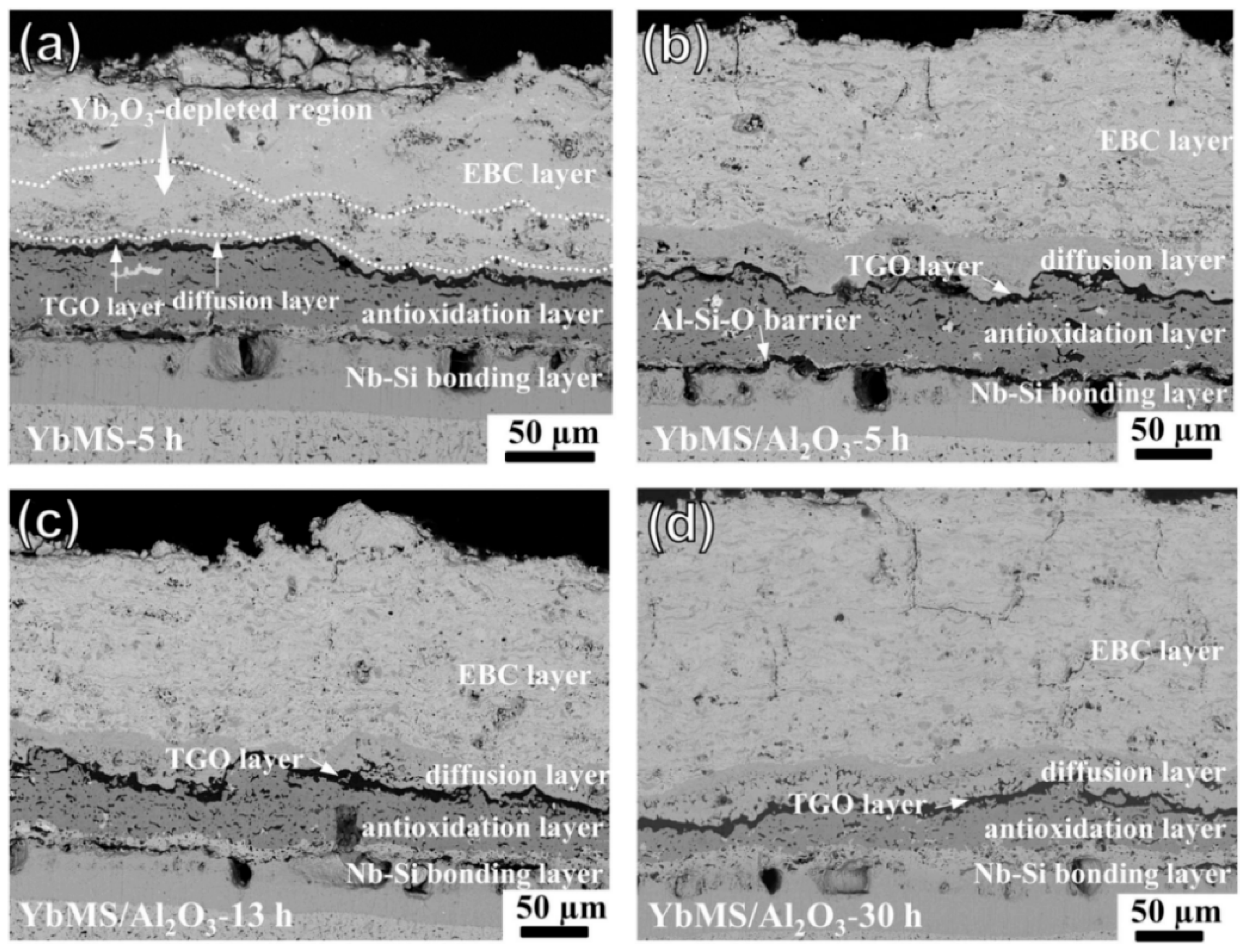 - Fan, K.; Guo, L.; Ou, H.; Li, H.; Sun, J. Microstructure and phase evolution of Yb2SiO5/MoSi2-Mullite environmental barrier coatings on niobium alloy at 1500 °C. Corros. Sci. 2023, 221, 111371. [Google Scholar] [CrossRef]