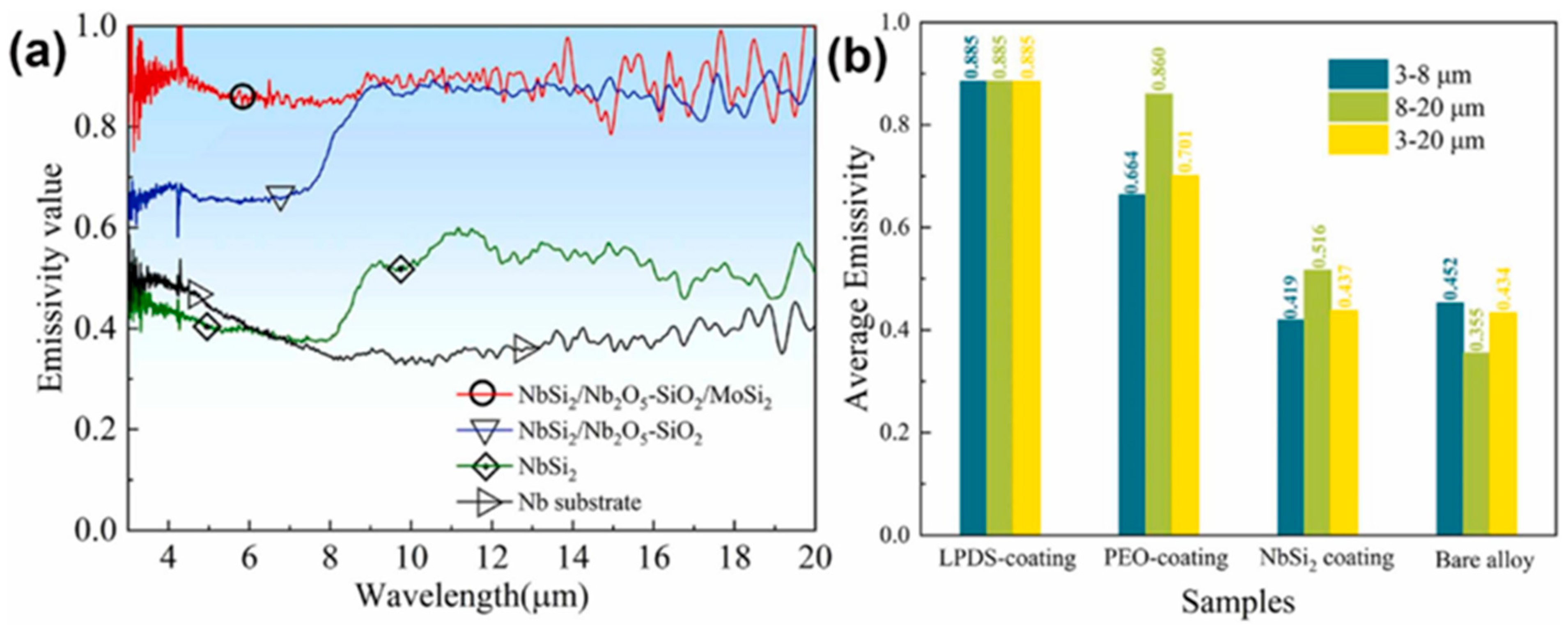 - Wang, Z.; Wang, Y.; Wang, S.; Zou, Y.; Chen, G.; Wen, L.; Zhang, G.; Zhao, L.; Ouyang, J.; Jia, D.; et al. High-temperature oxidation resistance and high emissivity of a novel NbSi2/SiO2-Nb2O5/MoSi2-Yb2O3 multilayer coating on Nb substrate for thermal protection. Corros. Sci. 2023, 224, 111519. [Google Scholar] [CrossRef]