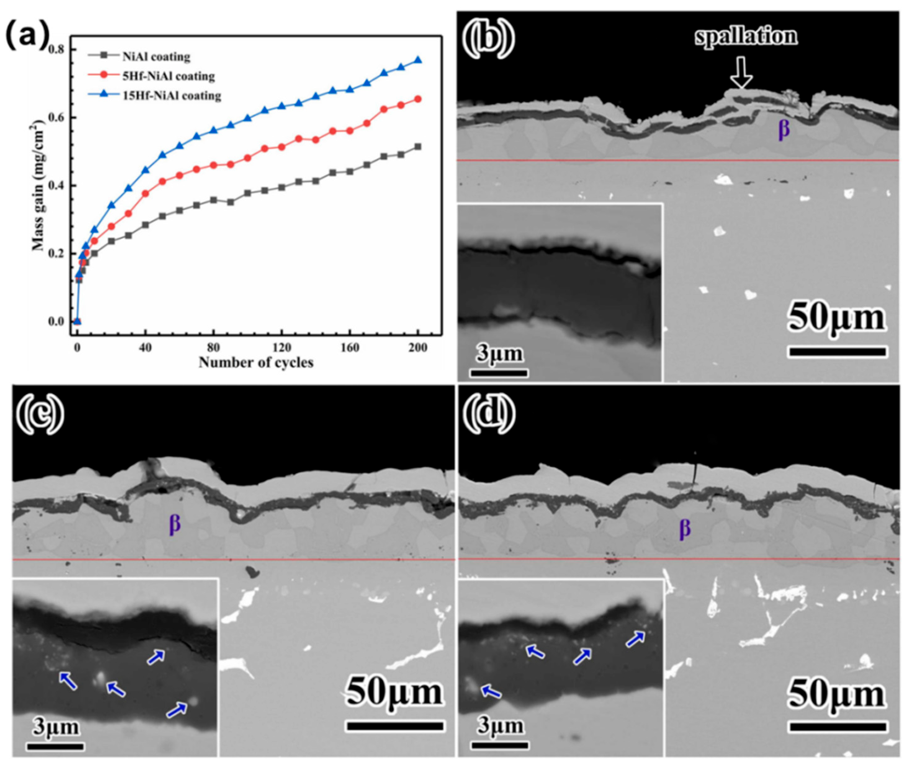 - Zhang, W.L.; Li, S.M.; Fu, L.B.; Li, W.; Sun, J.; Wang, T.G.; Jiang, S.M.; Gong, J.; Sun, C. Preparation and cyclic oxidation resistance of Hf-doped NiAl coating. Corros. Sci. 2022, 195, 110014. [Google Scholar] [CrossRef]