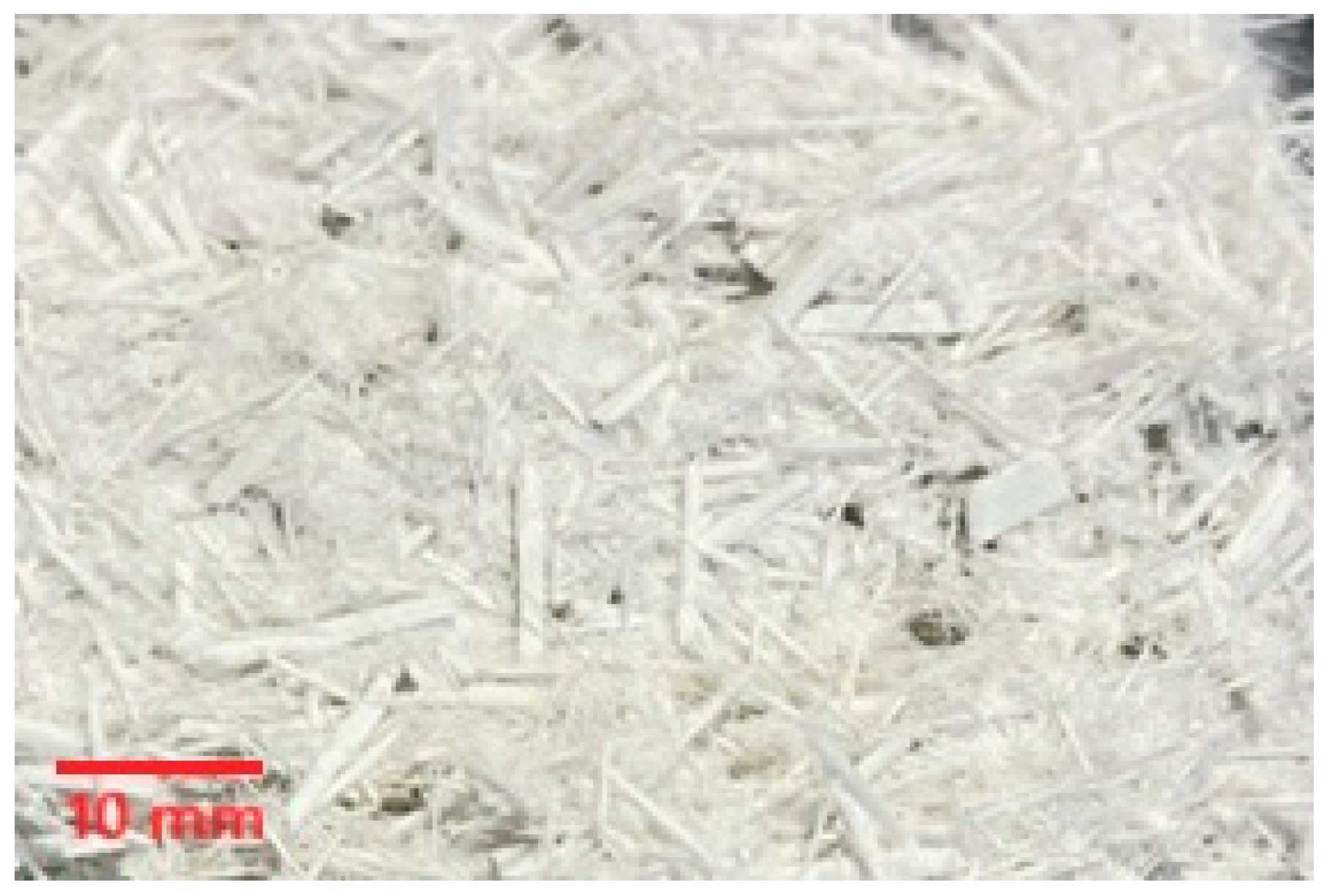 The fiber recycling procedure was conducted using a purely mechanical size-reduction approach. Pultruded polyester–glass rods were initially sectioned into 35 mm-long segments using a horizontal bandsaw (KC812W, Clausing Industrial, Kalamazoo, MI, USA) to enable controlled feeding into the shredding unit. These segmented pieces were subsequently processed in a rotary-blade shredder (Model 1012/B, SEM Inc., North Billerica, MA, USA), where they were continuously fractured by shear and impact forces until the fragments passed through the outlet screen located beneath the cutting chamber. To achieve a more homogeneous particle size distribution and promote progressive separation of glass fibers from the polyester matrix, multiple shredding passes were applied. During this stage, the material transitioned from dense rod fragments into a loose fibrous mixture comprising short fiber bundles and partially resin-coated fragments [15]. The mechanically recycled material was then collected, dried at ambient temperature, and stored in sealed polyethylene containers prior to composite preparation. The resulting recycled filler primarily consisted of irregularly shaped polyester–glass fragments with a broad aspect-ratio range, making it suitable for subsequent melt-compounding with thermoplastic matrices [16].