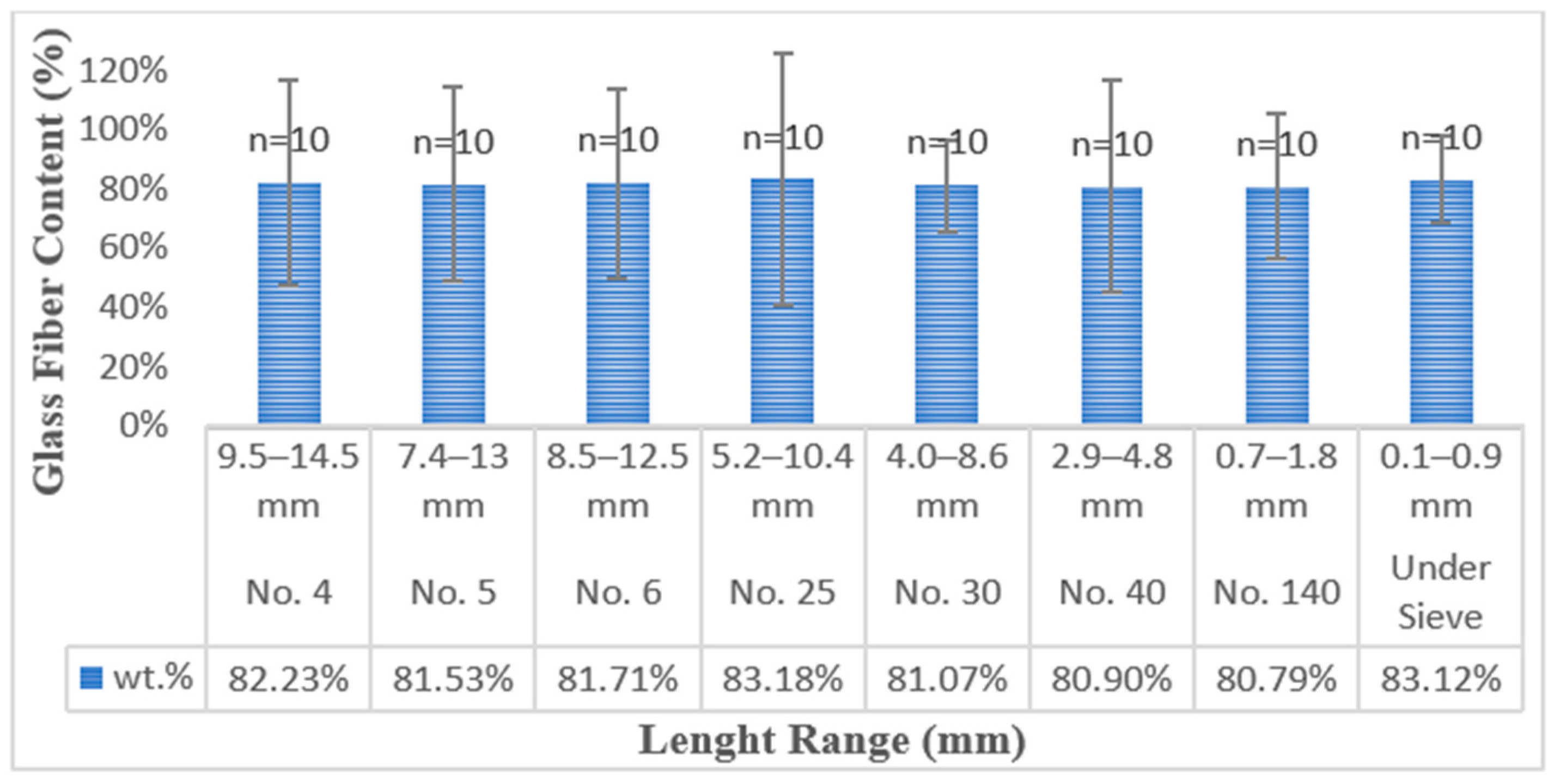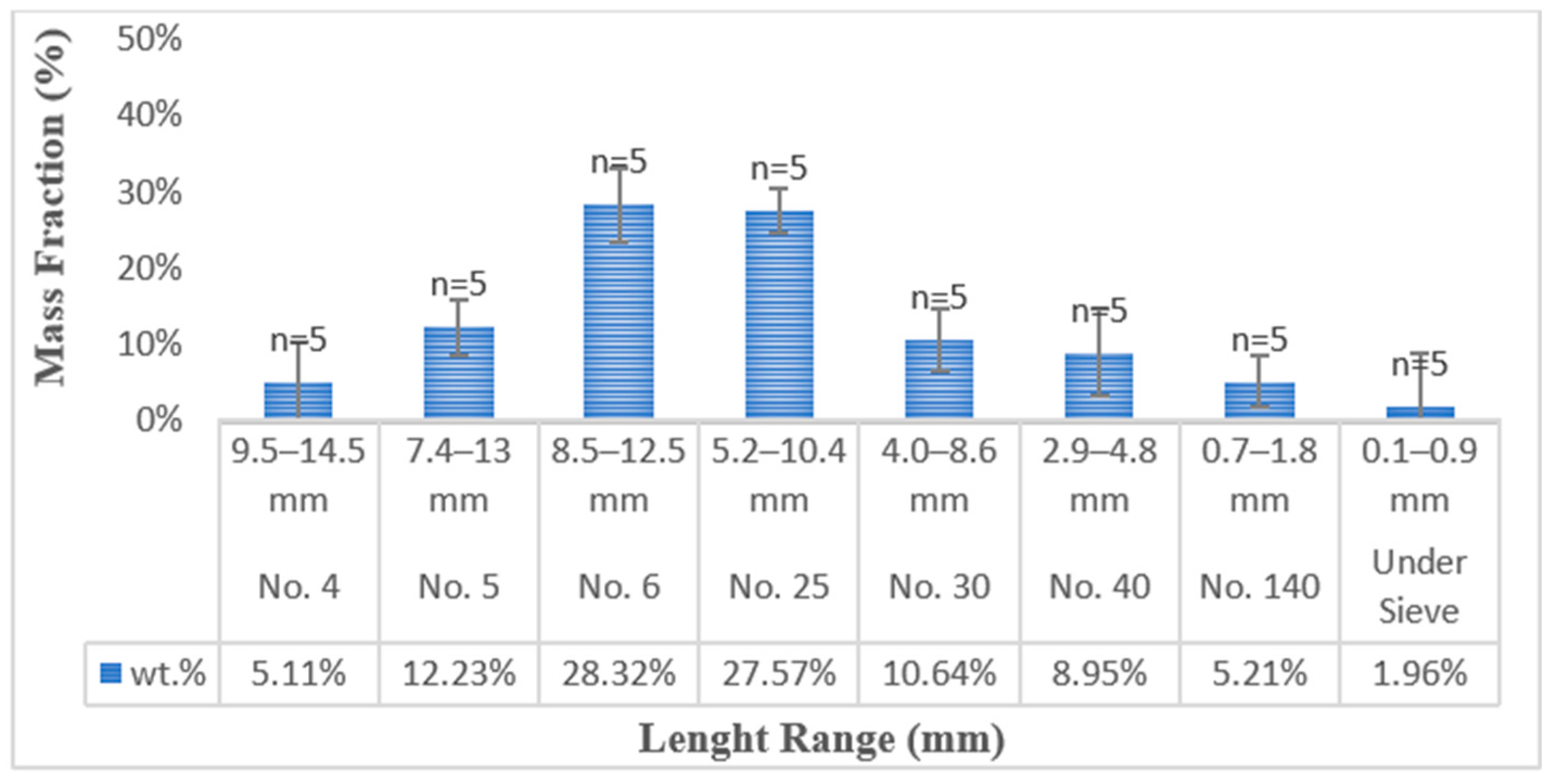 The dimensional distribution of the recycled PSs segments obtained from the sieving process is presented in Figure 3. The fiber-length intervals corresponding to each sieve fraction range from 0.1 mm to 14.5 mm, with the dominant size classes centered around 5–10 mm (No. 25) and 8–12 mm (No. 6). The mass distribution indicates that approximately 55.9 wt.% of the total recycled material lies within these two fractions, confirming that most fibers retained millimeter-scale continuity after mechanical shredding. Coarser bundles (>7 mm) accounted for ≈17 wt.%, whereas the fine fiber dust (<1 mm) represented only ≈2 wt.% of the total.
