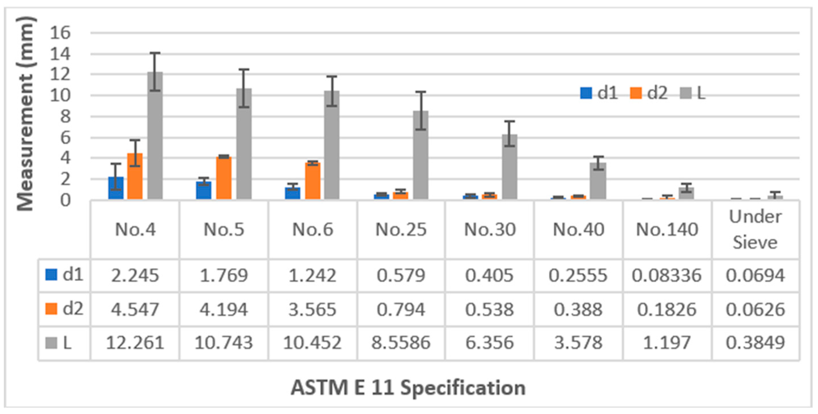 Further quantitative analysis of fiber geometry is given in Figure 4. The average fiber length (L) measured across all fractions was 6.8 ± 1.5 mm, while the corresponding mean width (d1) and thickness (d2) values decreased progressively with mesh size, from approximately 2.24 mm and 4.55 mm in the coarsest fractions to 0.069 mm and 0.063 mm in the finest under-sieve particles, respectively. This direct (proportional) correlation between fiber dimensions and sieve aperture demonstrates the gradual attrition and reduction in aspect ratio induced by repetitive mechanical shearing. Despite partial shortening, a significant proportion of elongated fibers (>5 mm) was preserved, suggesting that the recycled PS fillers maintain sufficient reinforcing capability for thermoplastic compounding [42].