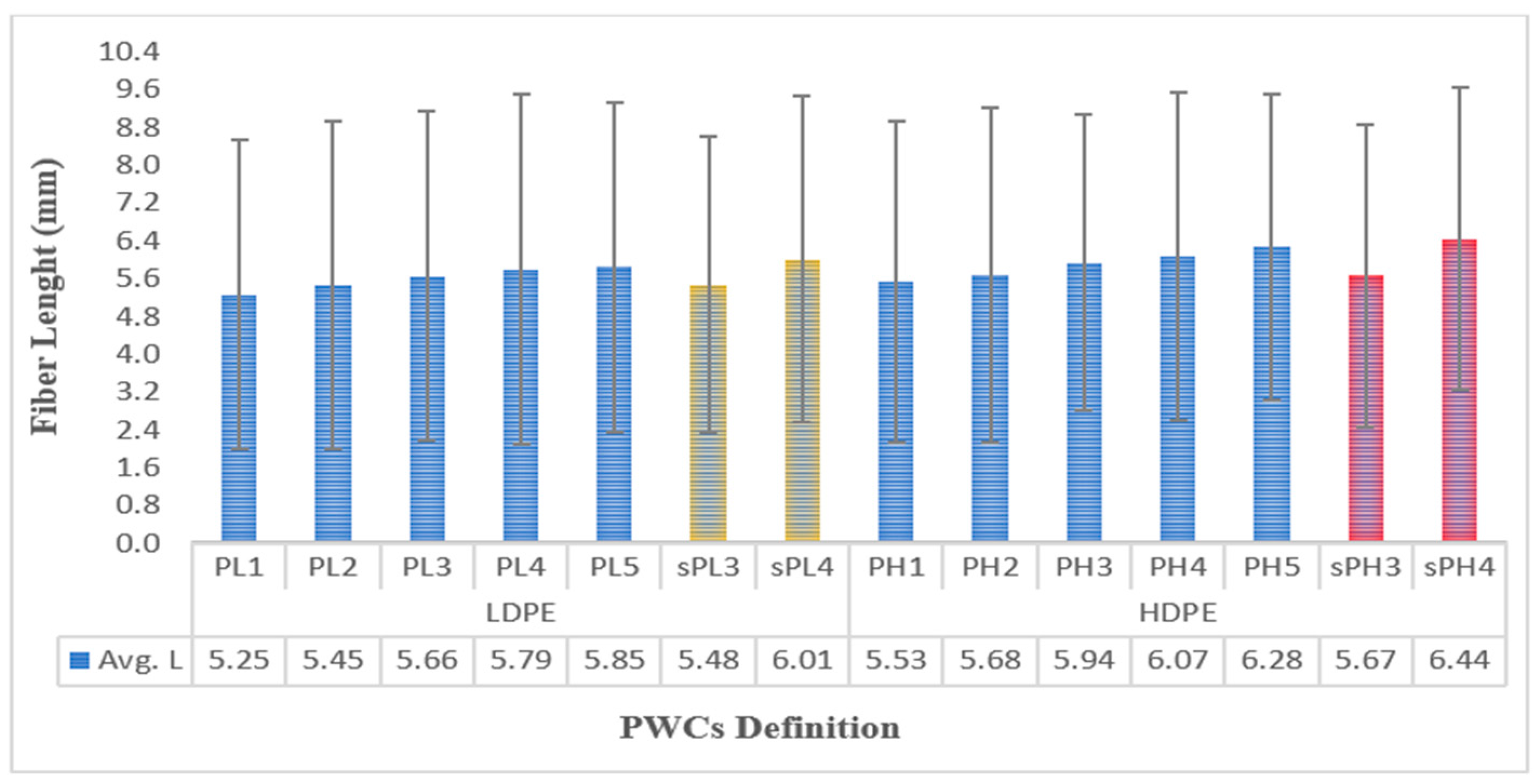 The average post-processing fiber lengths obtained from Figure 6 reveal a consistent size hierarchy governed by matrix viscosity and filler–matrix interaction [47]. LDPE-based composites exhibited mean fiber lengths between 5.25 mm (PL1) and 5.85 mm (PL5), whereas HDPE-based composites ranged from 5.53 mm (PH1) to 6.4428 mm (PH5). The higher viscosity and mechanical stiffness of HDPE limited shear-induced fiber attrition during melt blending, enabling slightly greater length retention compared with LDPE. This behavior is consistent with the fiber–matrix friction model, where viscous drag and restricted local flow reduce the frequency of fiber–fiber collisions and subsequent breakage [48,49].