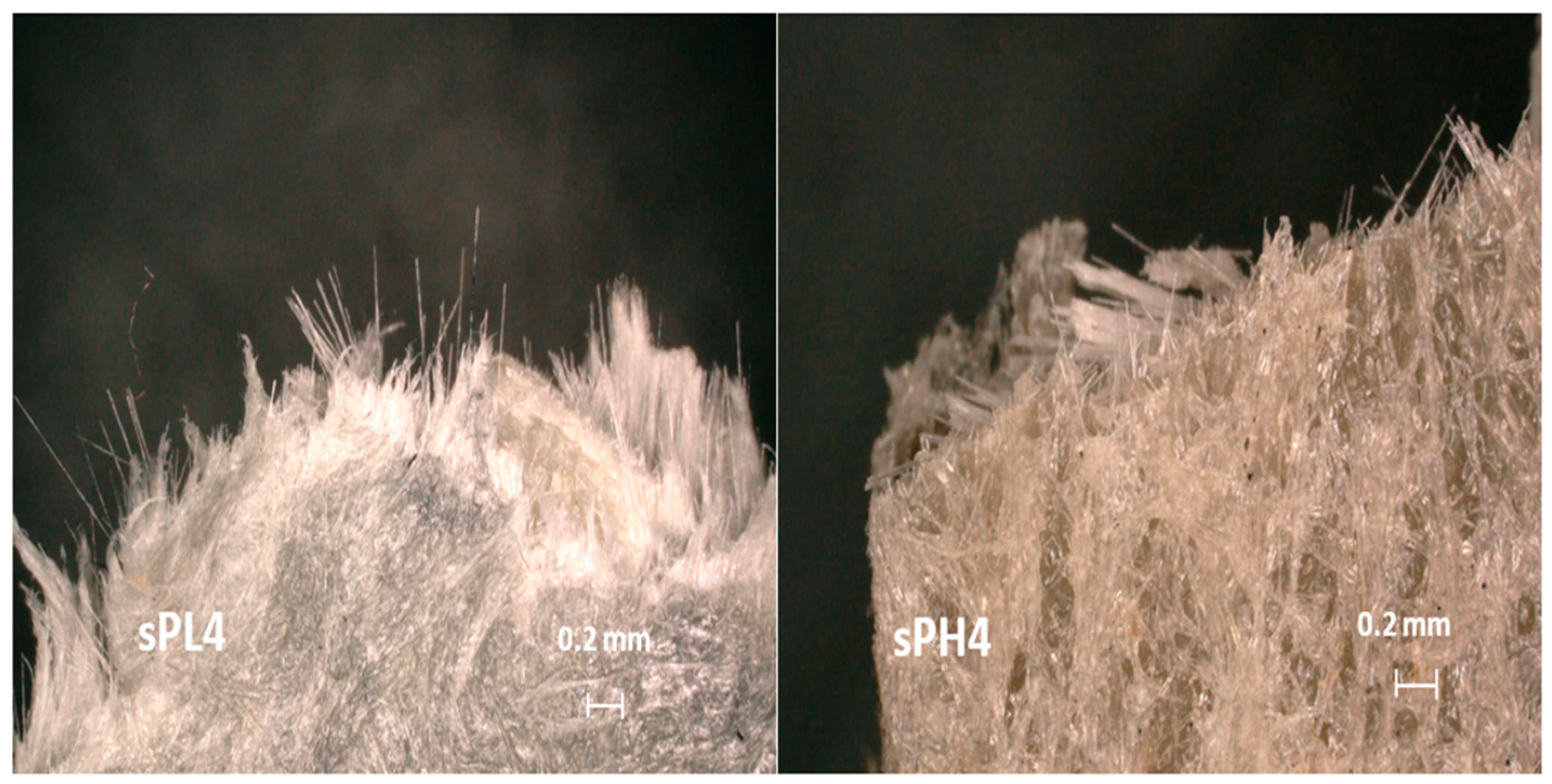 The influence of surface modification is clearly observable when comparing the surface-treated composites (sPL3, sPL4, sPH3, sPH4) with their untreated counterparts. The treated specimens exhibited average fiber lengths 0.20–0.40 mm longer than the corresponding unmodified composites. For example, the mean fiber length increased from 5.79 mm (PL4) to 6.01 mm (sPL4) and from 6.07 mm (PH4) to 6.44 mm (sPH4), whereas a slight decrease was observed for PL3 (5.66 mm → 5.48 mm) and PH3 (5.94 mm → 5.67 mm). These variations indicate that the effectiveness of the acid-based surface treatment depends on the filler concentration and matrix viscosity. Statistical analysis showed narrower standard deviations in the surface-treated groups (typically σ ≈ 0.25–0.30 mm) compared to untreated composites (σ ≈ 0.35–0.40 mm), confirming a more uniform fiber length distribution. This improvement is attributed to enhanced interfacial adhesion between the acid-activated PS filler surfaces and the polyethylene matrices, which reduces local shear slippage and fiber micro-cutting during extrusion. The reduced scatter supports that surface modification promotes more uniform stress transfer and mitigates random fiber attrition under melt-mixing conditions.