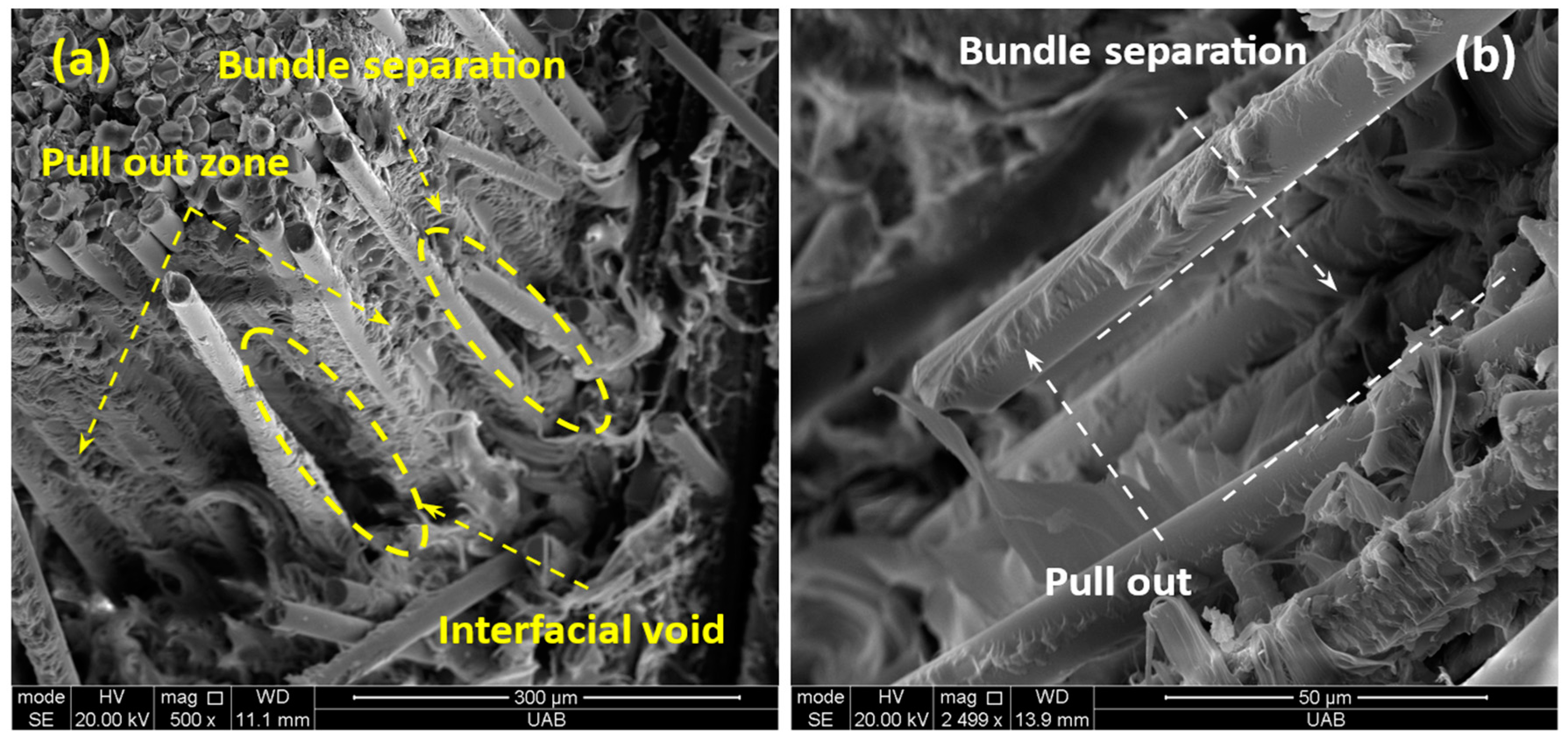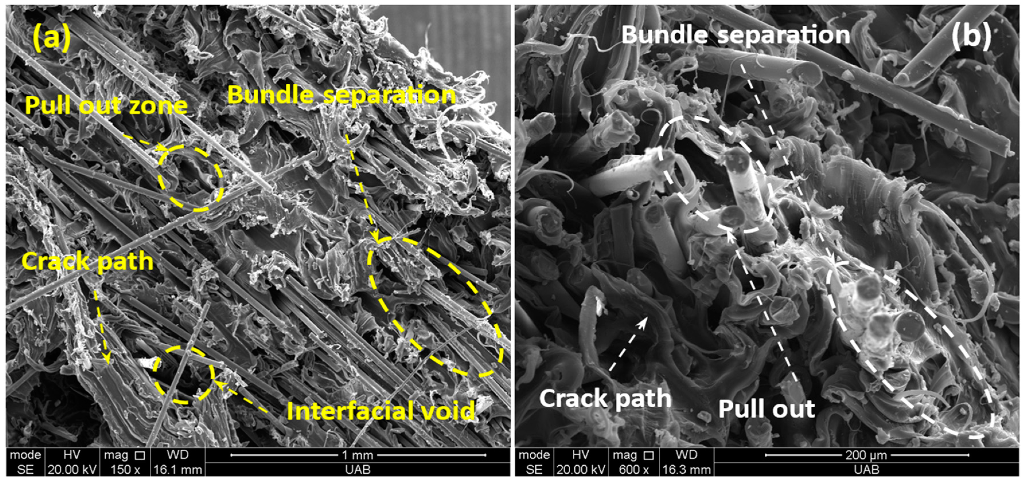 Following the mechanical tests, fracture surfaces of selected specimens were examined using scanning electron microscopy (SEM) to identify fiber–matrix interfacial characteristics, crack initiation, and propagation mechanisms [38]. All experimental results were reported as mean ± standard deviation (SD), and statistical evaluations were performed to ensure reliability and consistency among test groups. These mechanical characterizations collectively provide insights into the reinforcement efficiency, failure mechanisms, and overall structural integrity of the PWCs.