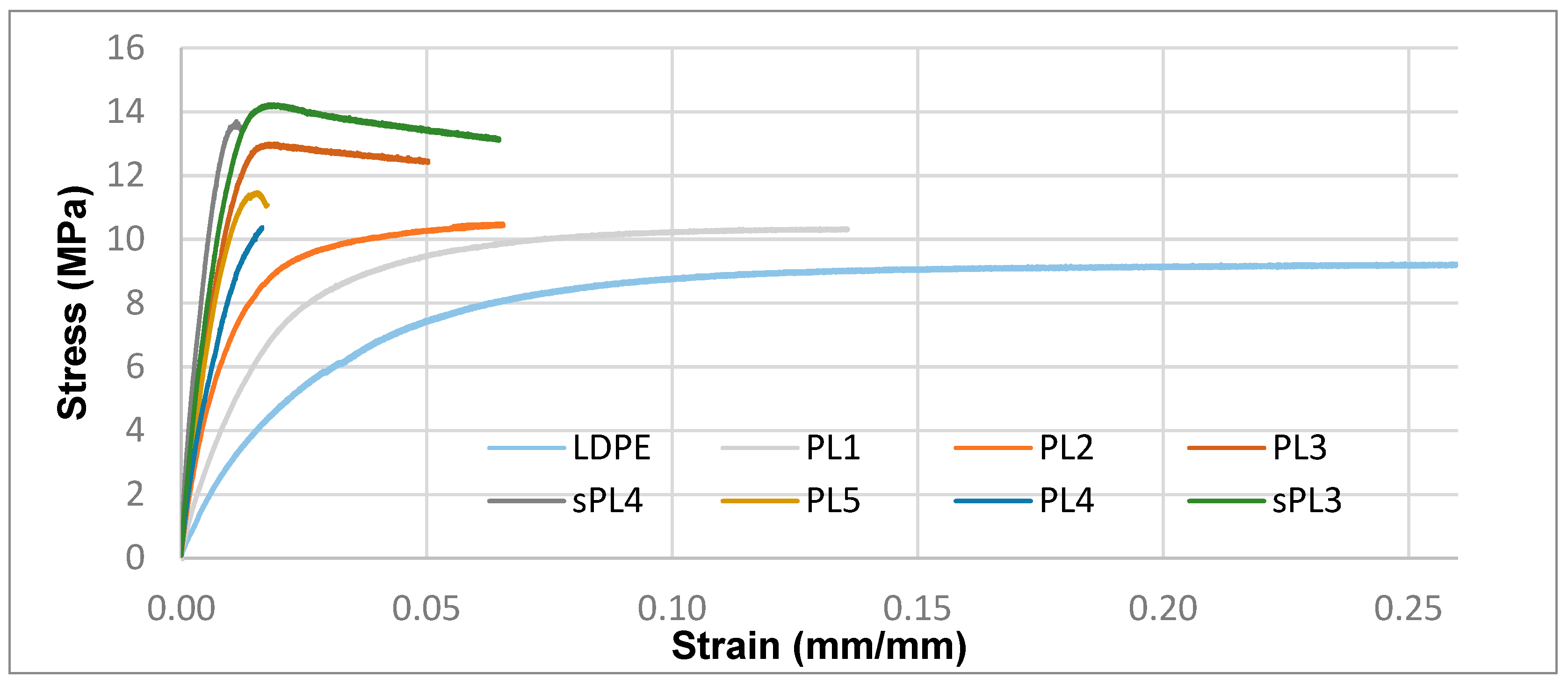 Low-filler composites (PL1–PL2 and PH1–PH2) show lower equilibrium moisture levels due to the hydrophobic nature of LDPE and HDPE. In contrast, high-filler materials (PL4–PL5 and PH4–PH5) display slower normalized moisture uptake behavior in Figure 7, consistent with increased tortuosity and restricted transport pathways in highly filled systems. It should be noted that Figure 7 presents normalized uptake curves (Mt/M versus √t), which primarily reflect sorption kinetics rather than absolute moisture absorption capacity. The equilibrium moisture content (M) is therefore more appropriately inferred from the gravimetric mass changes reported in Table 5.
