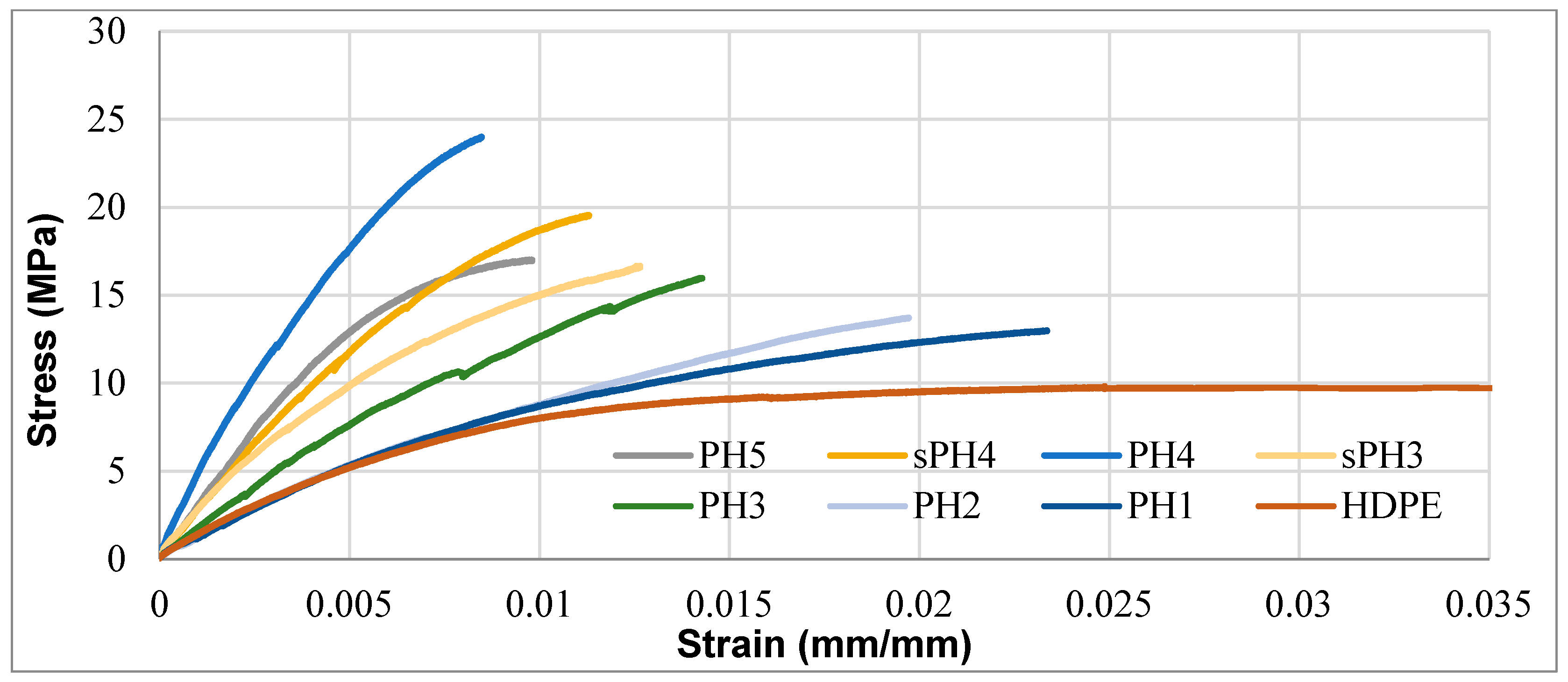 The mechanical performance of the PWCs was comprehensively evaluated through tensile, flexural, and impact tests to determine the influence of recycled polyester–glass (PS) fillers on the structural behavior of the thermoplastic matrices. All specimens were conditioned at room temperature for 48 h before testing to ensure equilibrium under ambient conditions [33,34]. Mechanical tests were conducted on a universal hydraulic testing machine (Instron Model 1331, Instron, Norwood, MA, USA) following internationally recognized standards.