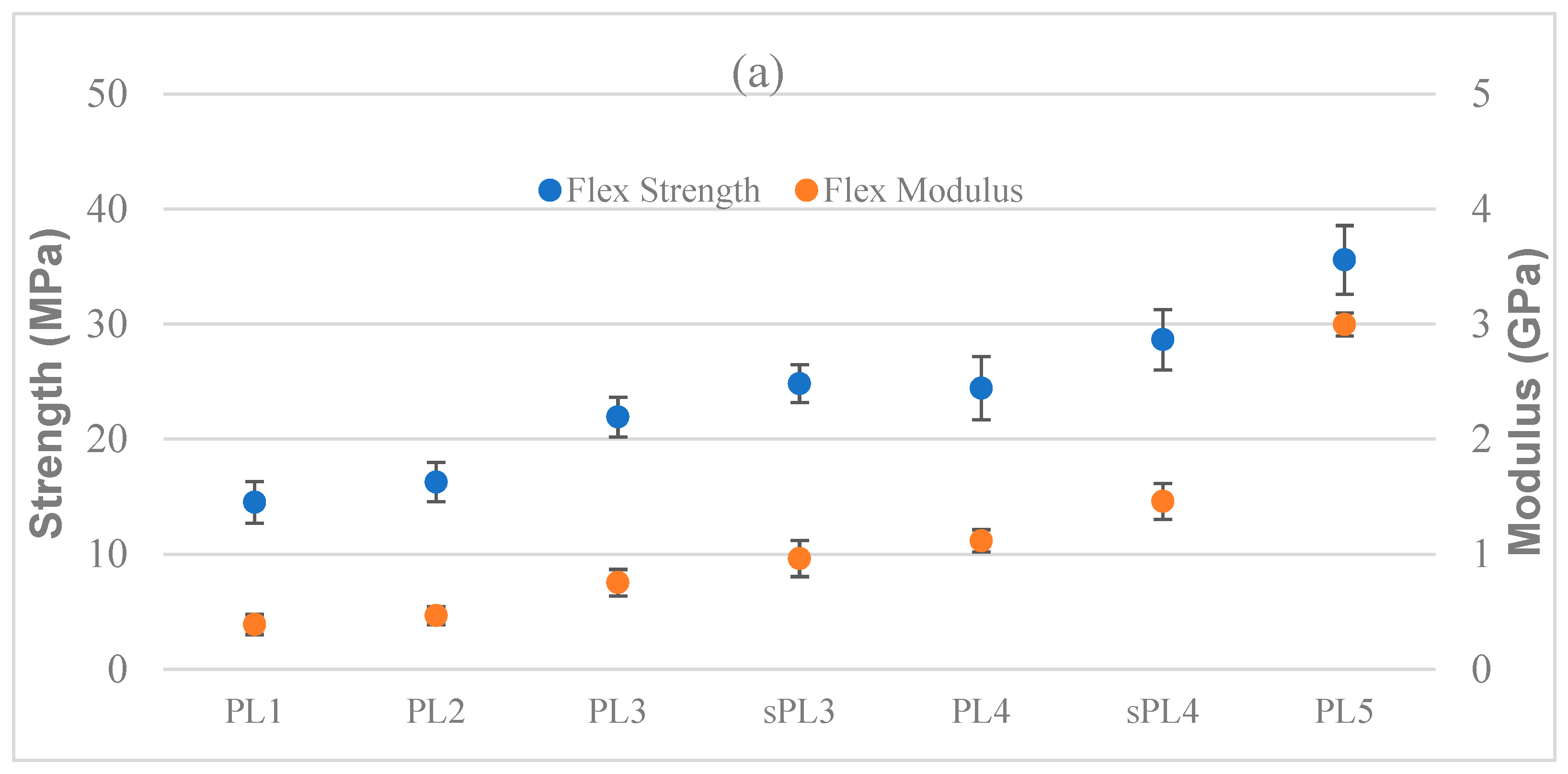3.2. Assessment of Recycled Polyester-Glass Fiber Filled Thermoplastic Composites (PWCs)