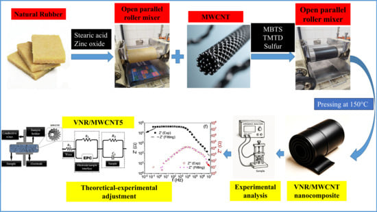 A sketch of the production and experimental analysis is shown in Figure 1, as well as a representation of the theoretical–experimental method used to evaluate the electrical characteristics of the VNR/MWCNT nanocomposite samples.