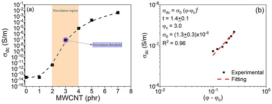 (a) DC electrical conductivity as a function of MWCNT concentration (phr) in VNR/MWCNT nanocomposite and (b) double logarithmic plot based on Equation (2).