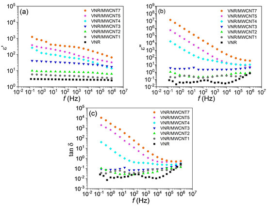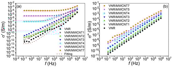 The behavior of σ′(f) and σ″(f) for VNR/MWCNT nanocomposites with different MWCNT concentrations is displayed in Figure 5a,b as a function of frequency. Figure 5a illustrates that the value of σ′(f) increases continuously with frequency for NR/MWCNT nanocomposite samples with concentrations below the percolation threshold (0, 1, 2, and 3 phr of MWCNT). This behavior indicates that the charge carriers are strongly influenced by the potential barriers that arise along the path due to the presence of thin NR layers separating the MWCNTs, which act as potential barriers, as well as the interfacial effect resulting from the trapping of charge carriers between the NR-MWCNT interfaces, resulting in strongly frequency dependent electrical conduction [31,41]. According to similar studies in the literature, this behavior is typical of disordered solids [63,64].