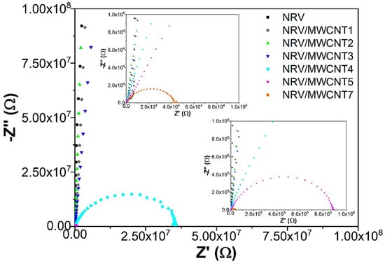 Even though it is crucial to study composite materials’ electrical properties under DC conditions, alternating electric fields (AC) are also important, since they provide a deeper understanding of electrical conduction when a material is subjected to a variable frequency AC electric field. In contrast to the DC regime, in which charge carriers follow relatively long interatomic paths in the direction of the electric field, in the AC regime they must continuously respond to rapid reversals of the alternating electric field. In heterogeneous and disordered systems, this dynamic interaction between matrices and conductive nanofillers allows the identification of electrical conduction and charge carrier relaxation within conductive nanocomposite materials [60]. Consequently, electrical impedance spectroscopy (EIS) provides a powerful analytical method for investigating the conduction and polarization mechanisms of different types of materials over a wide frequency range [61,62].