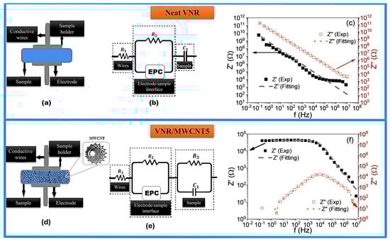 The dc regime analysis was conducted with the aid of a high-voltage power supply (model 247) coupled to an electrometer (model 610C), both from Keithley Instruments. The potential difference of 10 V was applied to samples with MWCNT concentrations greater than 2 phr. In the case of VNR/MWCNT nanocomposite with lower MWCNT concentrations, a voltage of 50 V was applied to compensate for their lower electrical conductivity. Using the applied voltage and current measured in the experimental analysis, the DC electrical conductivity (σdc) of VNR-MWCNT nanocomposite samples with different MWCNT phr concentrations was calculated, as given in Equation (1):