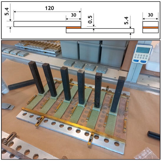 Adhesively bonded lap-shear samples were manufactured, as shown in Figure 2 (top), with substrates measuring 30 mm × 120 mm (width × length) with an overlap length of 30 mm, resulting in a nominal bonded area of 30 mm × 30 mm.