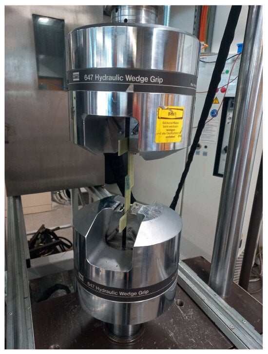For the lap-shear testing, the adhesively bonded joints were tested with a load cell of 250 kN in a servo hydraulic tensile testing machine (Model 810) from MTS (Berlin, Germany). Based on the standard DIN EN 1465 [33], tests were carried out in a controlled lab facility under 23 °C and 50% R.H. To ensure proper load alignment and minimise bending moments during testing, doublers were bonded to the clamping region to compensate for the offset due to the overlapping geometry, as shown in Figure 3. The test speed was 1 mm/min. The free length between the unclamped regions amounted to 150 mm. Six samples per adhesive were tested. Crosshead machine displacement and force were measured directly by the testing machine.