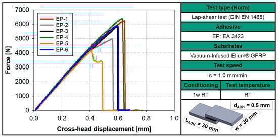 Force-displacement results (six repetitions) of lap-shear testing of the Elium© GFRP laminates bonded with the epoxy (EP) adhesive.