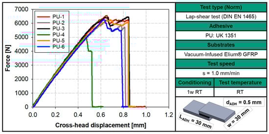 Force-displacement plots from six repetitions of lap-shear samples with the polyurethane (PU) adhesive are provided in Figure 8.