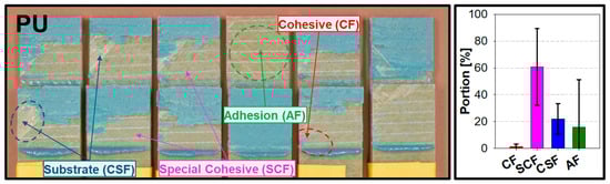 Relevant resulting parameters are given in Table 3. The adhesive layer thickness of PU-bonded samples exhibited slightly higher variation compared to the EP adhesive, with a standard deviation of 37.7%. Based on Pearson’s r, PU samples showed no clear correlation between adhesive layer thickness and the attained shear strength (p = 0.992). Regarding processing, the polyurethane adhesive showed good behaviour. However, as the pot life of PU (20–30 min) was shorter than that of the EP adhesive (30–60 min), adhesive application might require more planning to avoid premature cure initiation before proper positioning.