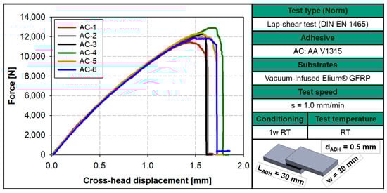 The resulting force-displacement curves of the lap-shear testing with the acrylate (AC) adhesive are shown in Figure 11. Key parameters are given in Table 4.