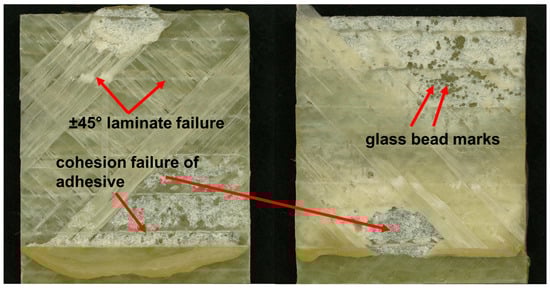 The fracture surface analysis was carried out according to DIN EN ISO 10365 [34]. Optical microscopy images were taken with a digital microscope VHX-7000 (Keyence Deutschland GmbH, Neu-Isenburg, Germany). For failures on the substrate laminate, the following fracture classes were identified: substrate failure (SF), cohesive substrate failure (CSF), and delamination failure (DF). Similarly, for failure on the adhesive layer, the classes of cohesion failure (CF), special cohesion failure (SCF), and failure with stress whitening of the adhesive (SWCF) were taken into account. Each sample was analysed using the Version 1.54 of the Software Image J, and then the average for the testing set was obtained.