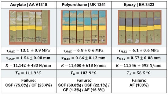 Comparison of key parameters from lap-shear testing and DMA of adhesively bonded samples of GFRP-Elum© laminates with acrylate, polyurethane, and epoxy | CSF (cohesive substrate failure), CF (cohesion failure), SCF (special cohesion failure), and AF (adhesion failure).