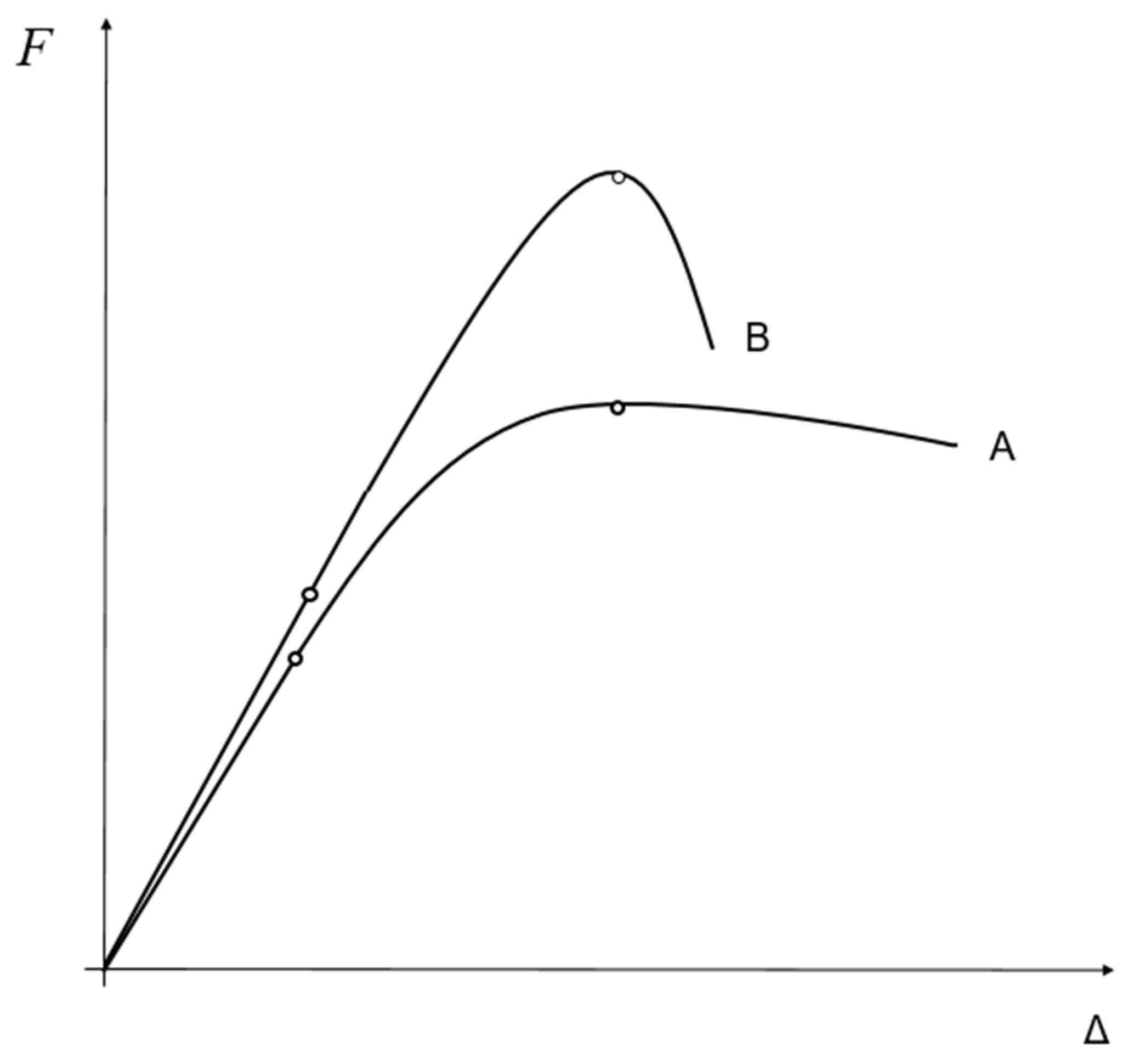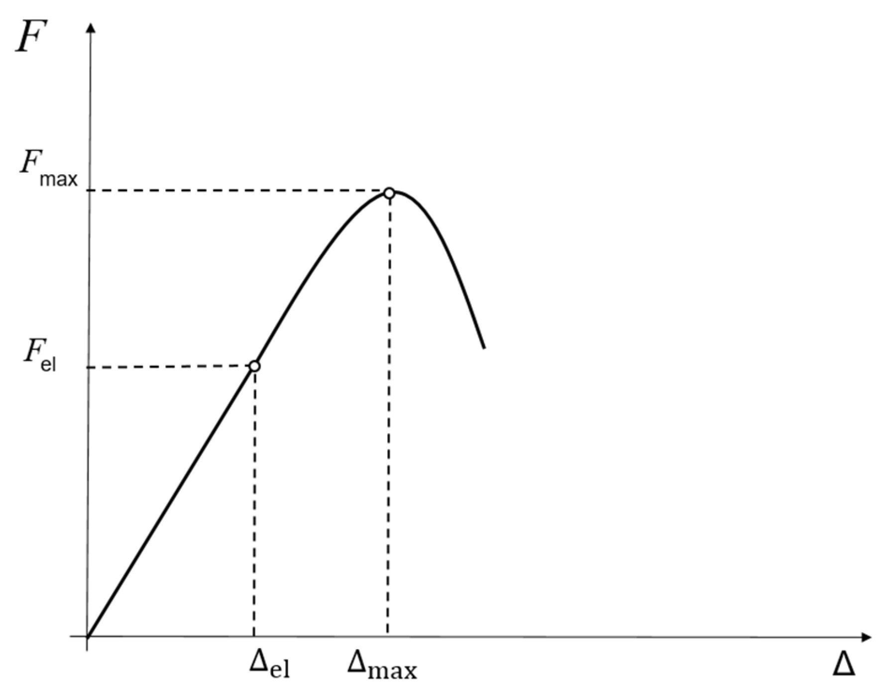 - The apparent hardening phase terminates when the maximum force, , is reached. This occurs at a specific, critical length of the softening zone , at which point the rate of strength loss from damage overcomes the rate of strength gain from redistribution.