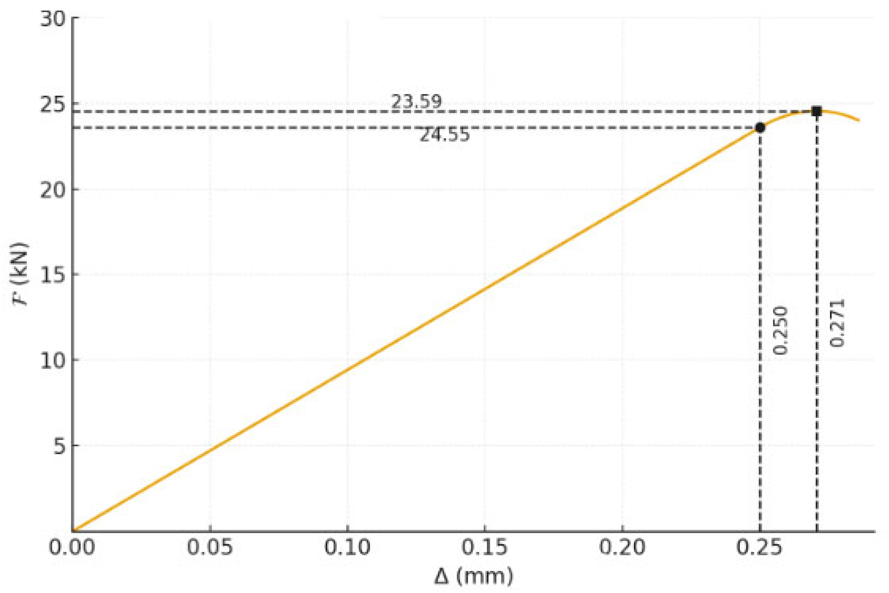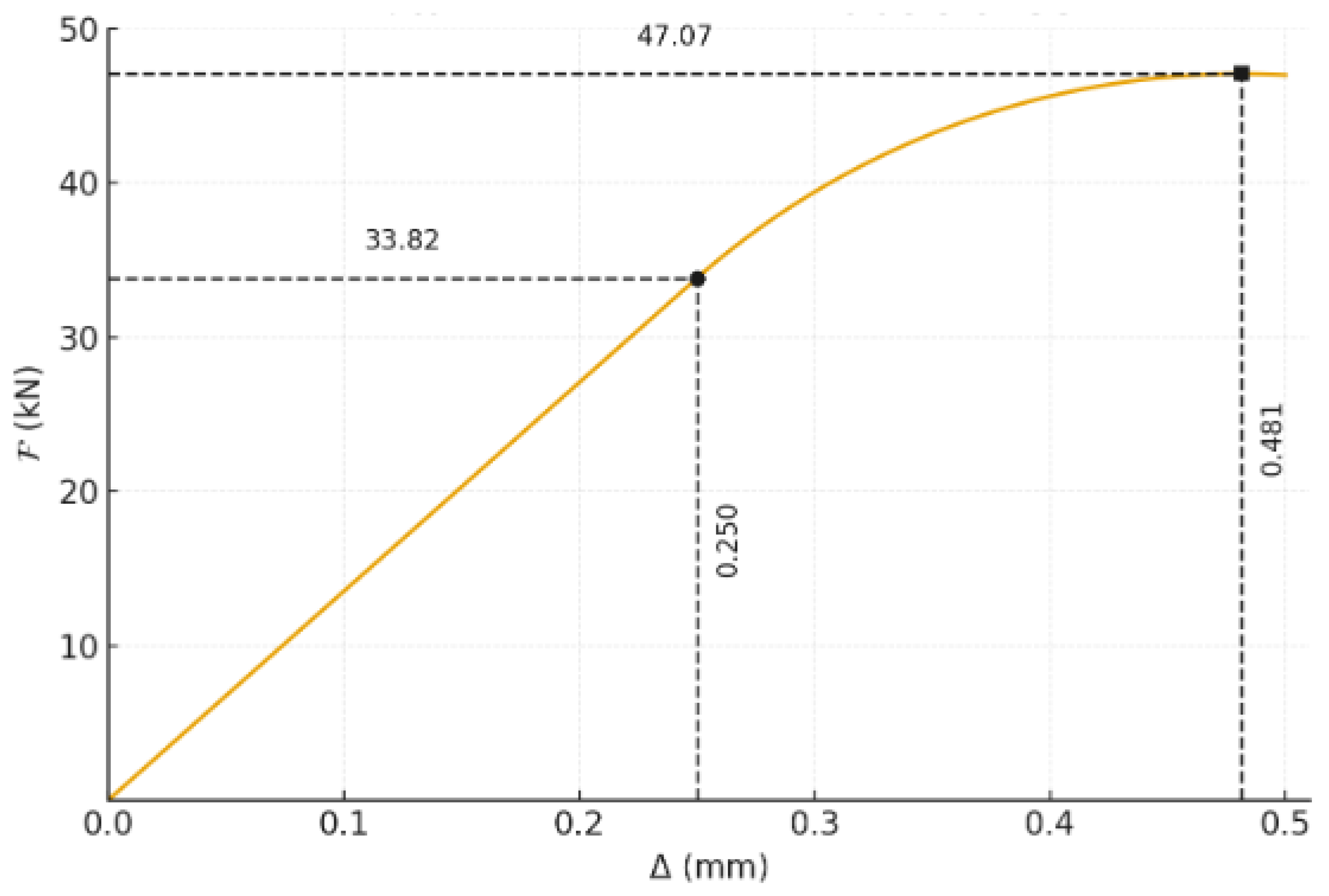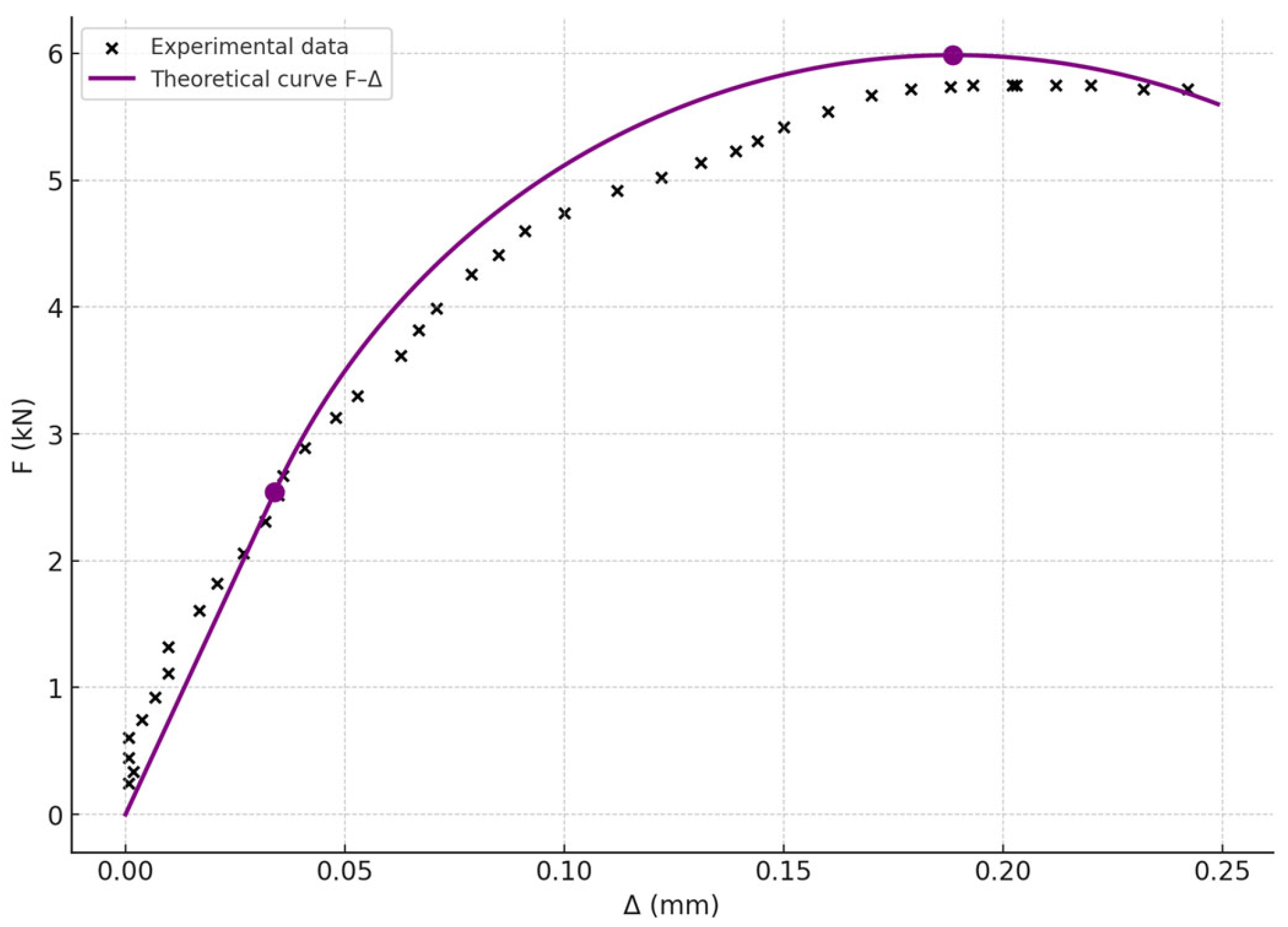 - The progressive hardening phase (from to ): This is the curvilinear segment between the elastic limit and the maximum force. Even though the interface material at the loaded end has already entered its softening branch, the global resistance of the system continues to increase. This apparent system “hardening” is due to stress redistribution: as the damage zone grows, it “activates” new, undamaged sections of the elastic zone (Zone I) deeper in the anchorage, which contribute to the increase in total force. The curve here is constructed parametrically via the equations and .
