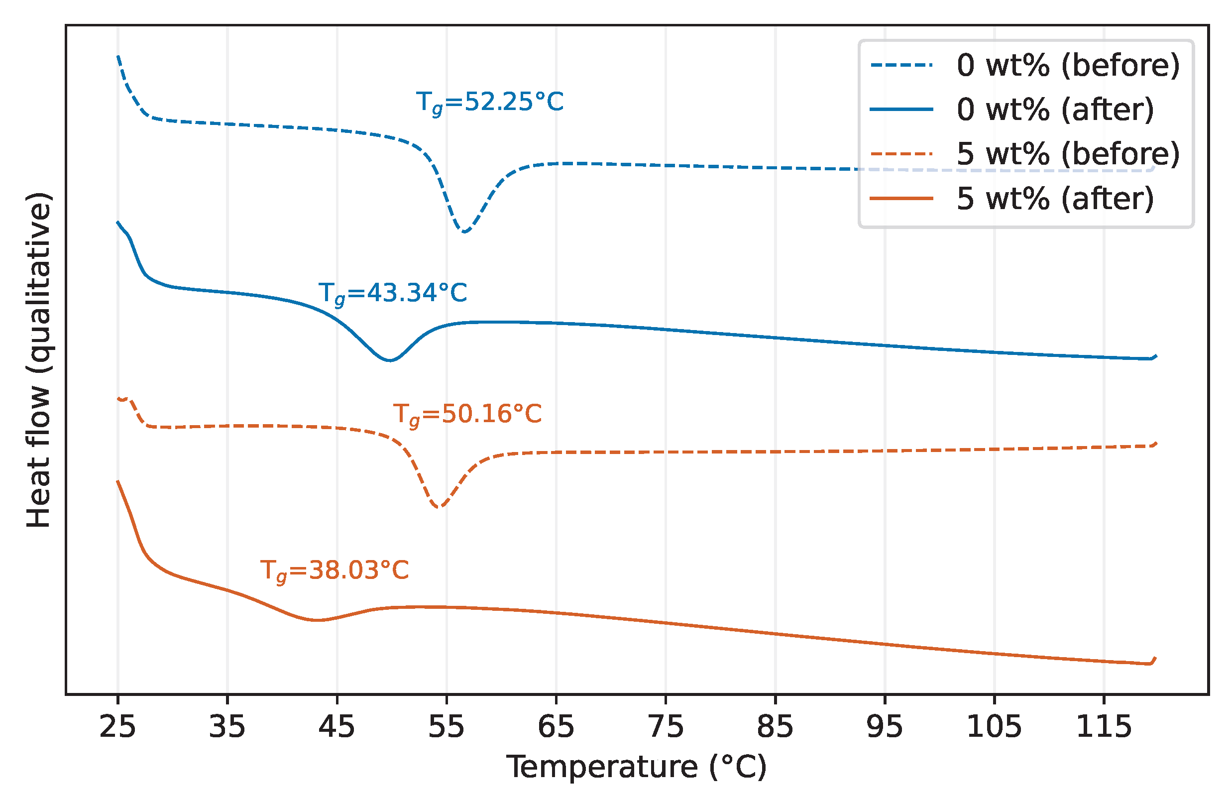 - DSC revealed a decrease in glass transition temperature with increasing particle content and after water absorption, with the largest decrease seen for the 5 wt% epoxy composite. Together with TGA, which showed only a modest gain in thermal stability, this indicated that silica-induced softening and moisture plasticisation dominated over any small improvements in high-temperature behaviour.