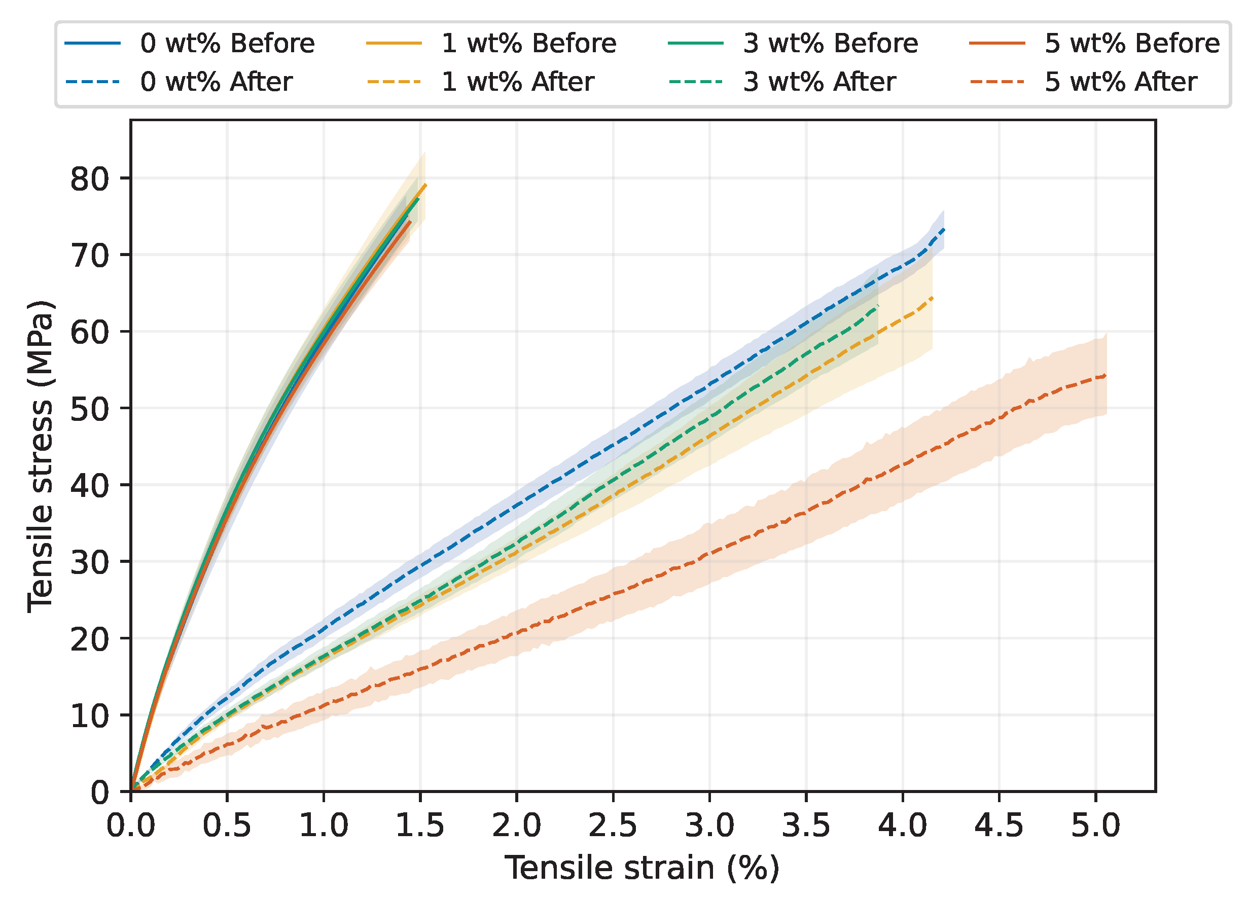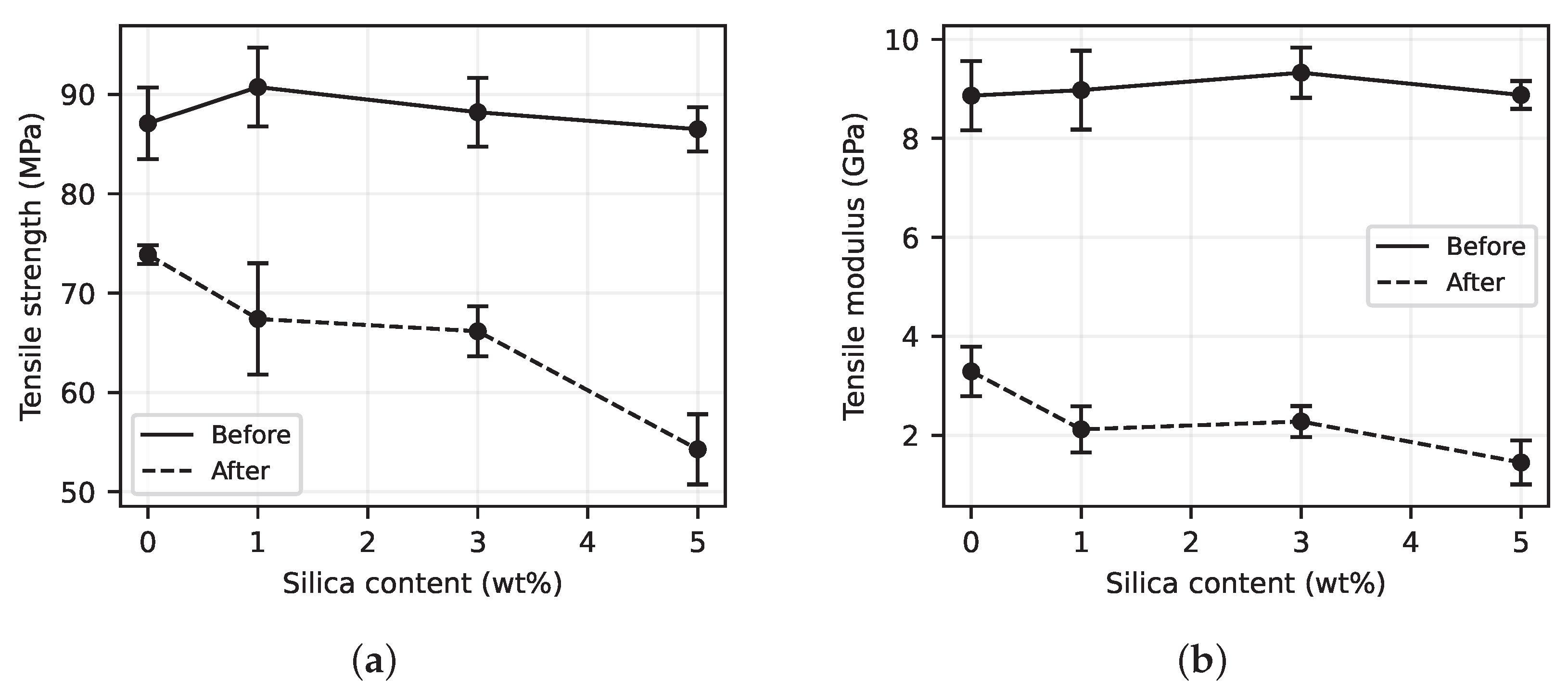 - Under dry conditions, tensile stiffness and strength were only weakly affected by silica addition. After water saturation, however, stiffness and strength were significantly reduced for all laminates, with the most severe degradation in the 5 wt% configuration. This behaviour was consistent with the combined effects of higher moisture uptake and void-related stress concentrations in the highly filled material. As mechanical testing was conducted at 23 °C, the observed degradation reflected both moisture-induced effects and the proximity of the reduced to the test temperature. Multi-temperature testing is recommended for future studies to further distinguish these mechanisms.
